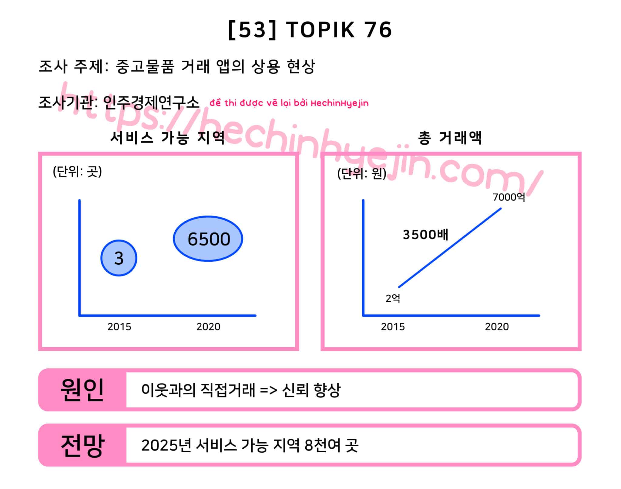 최근 인주경제연구소에서는 중고물품 거래 앱의 사용 현황에 대한 조사를 실시하였다. 조사 결과, 2015년에는 단 3곳에 불과했던 서비스 가능 지역이 2020년에는 무려 6,500곳에 달하는 것으로 조사되었다. 이에 따라 총 거래액은 2015년 2억 원에서 2020년 7,000억 원으로 3,500배 증가하였다. 이러한 증가의 원인은 이웃과의 직접거래로 인한 신뢰 향상 때문인 것으로 분석되었으며, 2025년에는 서비스 가능 지역이 8천여 곳에 이를 것으로 전망되었다.