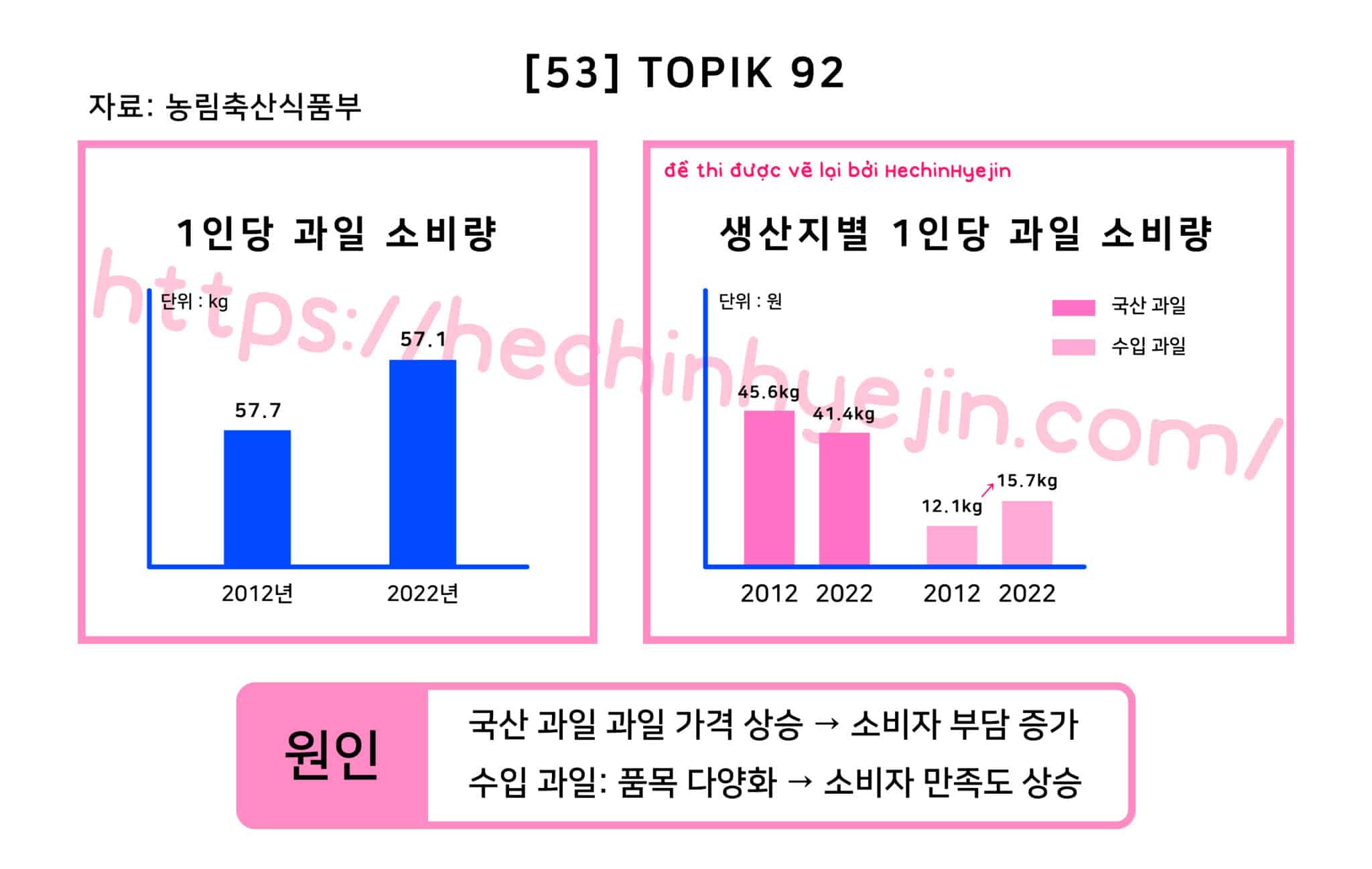 국내 과일 소비량의 변화에 대한 농림축산식품부의 자료에 따르면 2010 년에 57.7kg에 달했던 1인당 과일 소비량은 2022 년에는 57.1kg로 소폭 감소한 것으로 나타났다. 한편에 생산지별 1인당 과일 소비량을 살펴보면 같은 기간 국산 과일은 45.6kg에서 41.4kg로 줄어든 반면에 수입 과일은 12.1kg에서 15.7kg로 늘었음을 볼 수 있다. 국산 과일 소비량 감소의 원인은 과일 가격이 상승함에 따라 소비자의 부담이 더해졌기 때문이다. 수입 과일 소비량 증가의 원인은 품목이 다양화되어 소비자 만족도가 상승했기 때문이다.