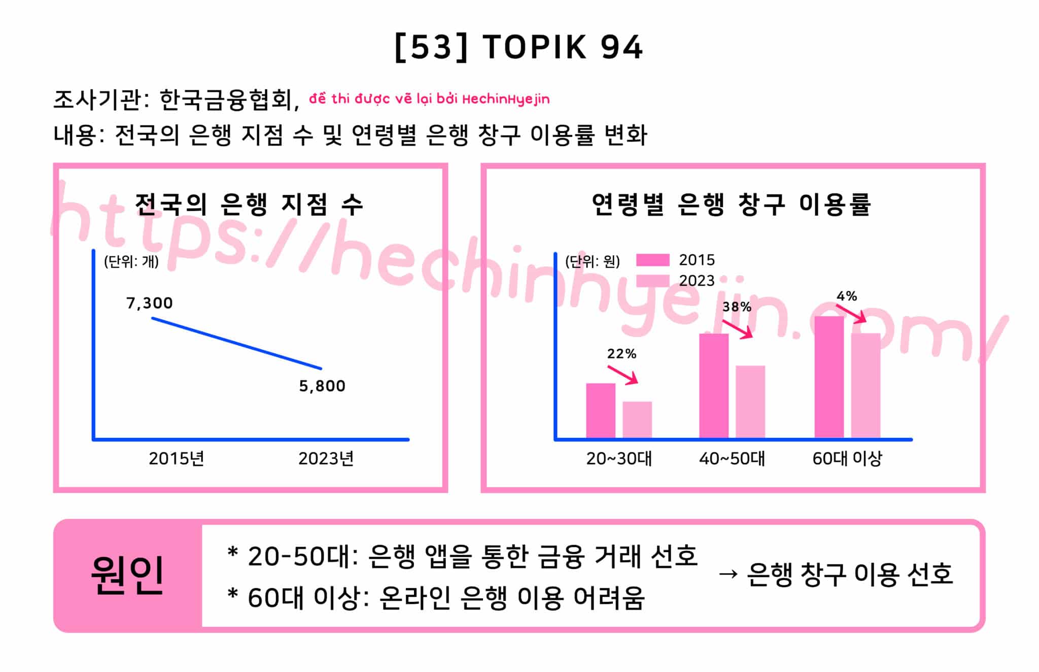 한국금융협회에서 '전국의 은행 지점 수 및 연령별 은행 창구 이용률 변화'에 대해 조사한 결과, 전국 은행 지점 수가 2015년 7300개에서 2023년 5800개로 감소한 것으로 나타났다. 그리고 같은 기간 동안 연령별 은행 창구 이용률의 경우 20~30대는 22%가 감소하고 40~50대는 38%가 감소한 반면에, 60대 이상은 4%만 소폭 감소한 것으로 나타났다. 이러한 변화의 원인으로는 20~50대의 경우에는 은행 앱을 통한 금융 거래를 선호하고, 60대 이상의 경우에는 온라인 은행을 이용하기가 어려워서 은행 창구를 이용하는 것을 선호하기 때문으로 분석되었다.