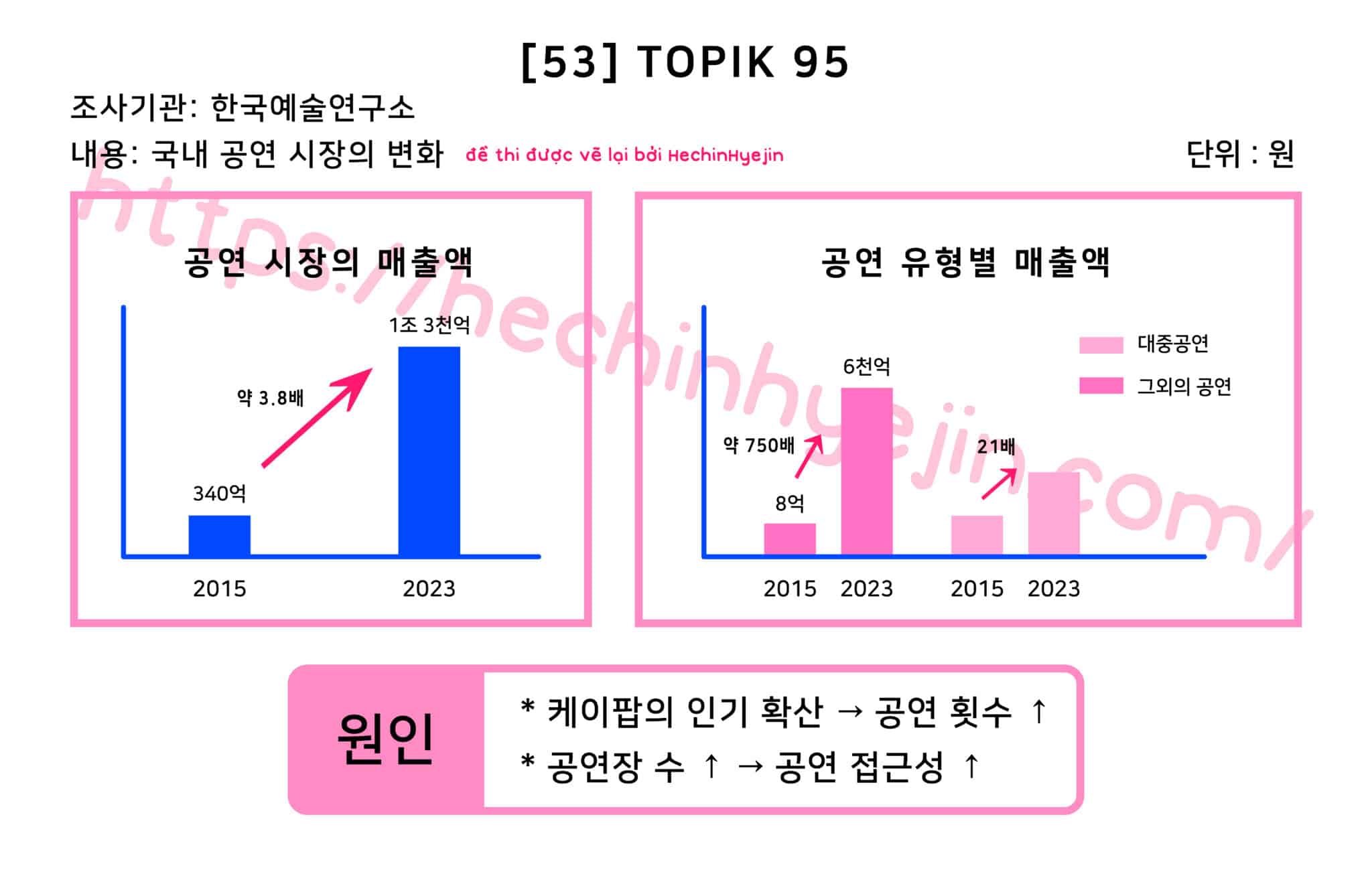 한국예술연구소에서 국내 공연 시장의 매출액 변화에 대해 조사를 실시하였다. 조사 결과에 따르면 공연 시장의 매출액은 2015년 340억 원에서 2023년 1조 3천억 원으로 약 3.8배 증가하였다. 공연 유형별 매출액을 살펴보면 대중공연은 같은 기간 8억 원에서 6천억 원으로 약 750배 크게 증가하였고 그 외의 공연은 약 21배 증가한 것으로 나타났다. 이 같은 공연 매출액 증가의 원인은 케이팝 인기 확산에 따른 공연 횟수 증가와 공연장 수 증가로 인한 공연 접근성을 들 수 있다. 이 같은 공연 매출액 증가의 원인은 케이팝 인기의 확산으로 공연 횟수가 많아졌기 때문이고, 공연장 수 증가로 인해 공연 접근성이 좋아졌기 때문이다.