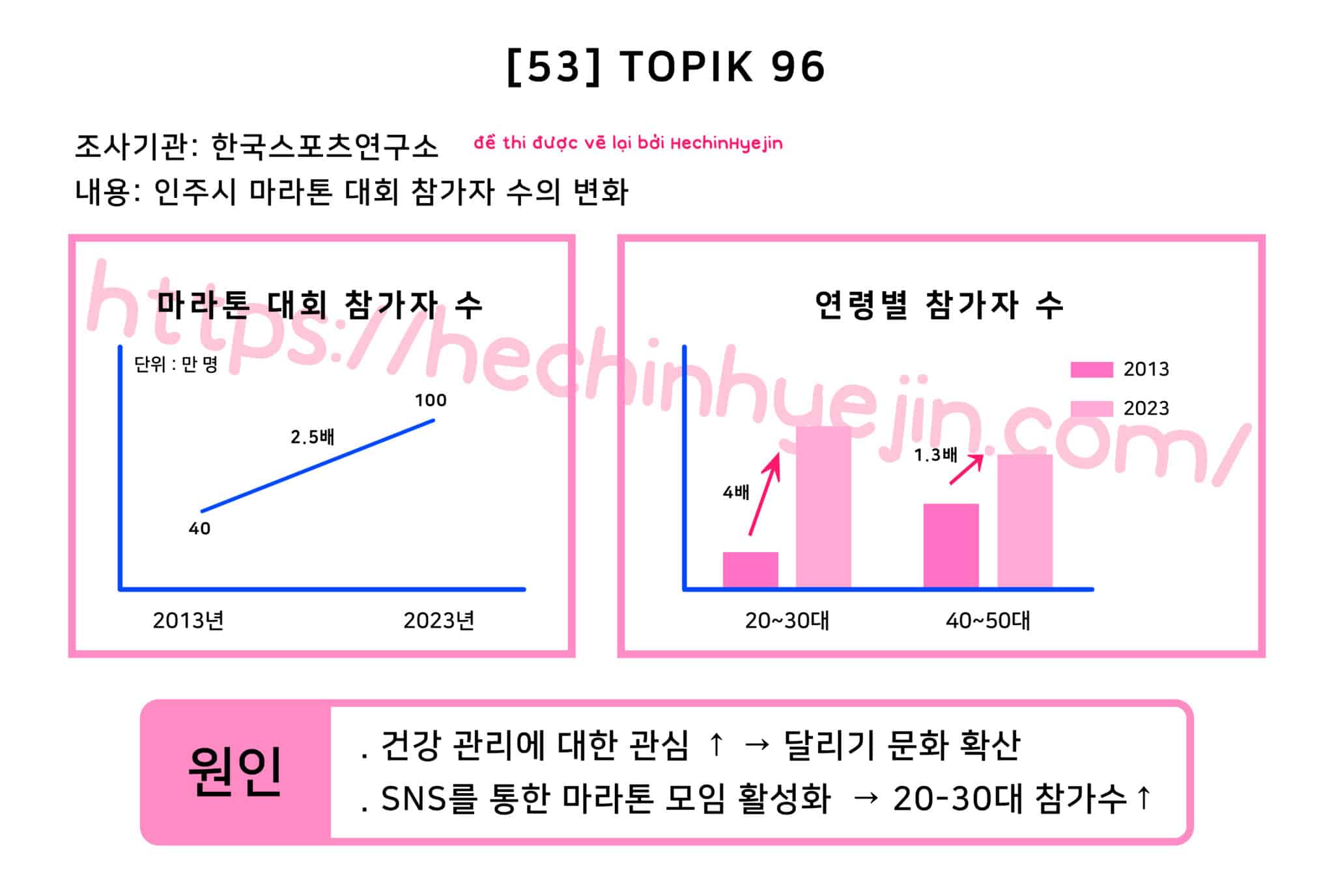 한국스포츠연구소에서 ‘인주시 마라톤 대회 참가자 수 변화’에 대해 조사한 결과, 인주시 마라톤 대회 참가자 수가 2013년 40만 명에서 2023년 100만 명으로 10년 동안 2.5배 증가한 것으로 나타났다. 그리고 같은 기간 동안 인주시 마라톤 대회의 연령별 참가자 수는 20~30대에서 4배로 대폭 증가하였고, 40~50대에서 1.5배로 소폭 증가한 것으로 나타났다. 이러한 변화의 원인으로는 건강 관리에 대한 관심이 많아지면서 달리기에 대한 인식이 확산되었고, SNS를 통한 마라톤 모임이 활성화되면서 20~30대의 참가자 수가 증가하였기 때문으로 분석되었다.