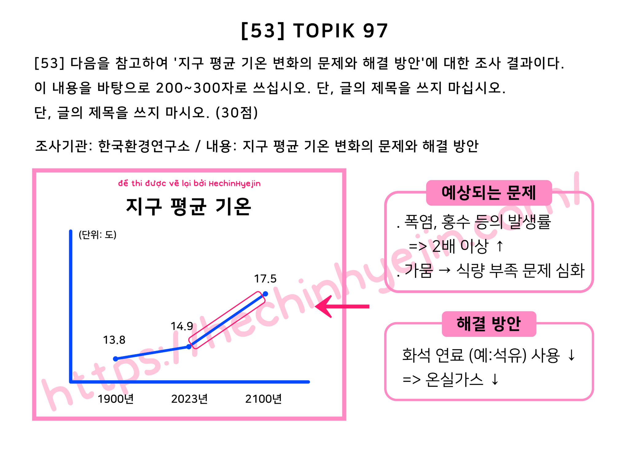 한국환경연구소에서 ‘지구 평균 기온 변화의 문제와 해결 방안’에 대해 조사한 결과, 지구 평균 기온이 1900년에 13.8도에서 2023년에 14.9도로 증가한 것으로 나타났다. 그리고 앞으로 2100년에는 17.5도로 증가할 것으로 예상되었다. 이러한 기온 변화로 인해 폭염, 홍수 등의 발생률이 2배 이상 올라가고 가뭄으로 인한 식량 부족 문제가 심화될 것으로 예상되었다. 따라서 이 문제를 해결하기 위해서 석유와 같은 화석 연료의 사용을 줄여서 온실가스 배출을 감소시켜야 할 것으로 분석되었다.
