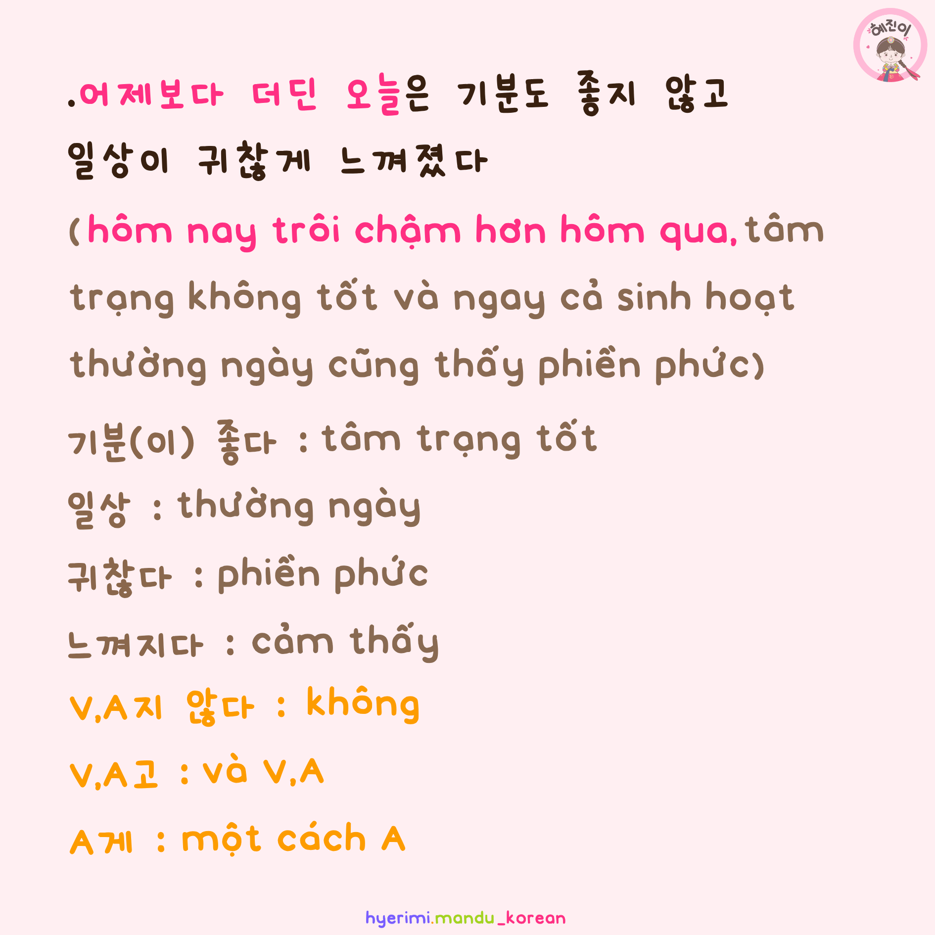 (hôm nay trôi chậm hơn hôm qua, tâm trạng không tốt và ngay cả sinh hoạt thường ngày cũng thấy phiền phức)