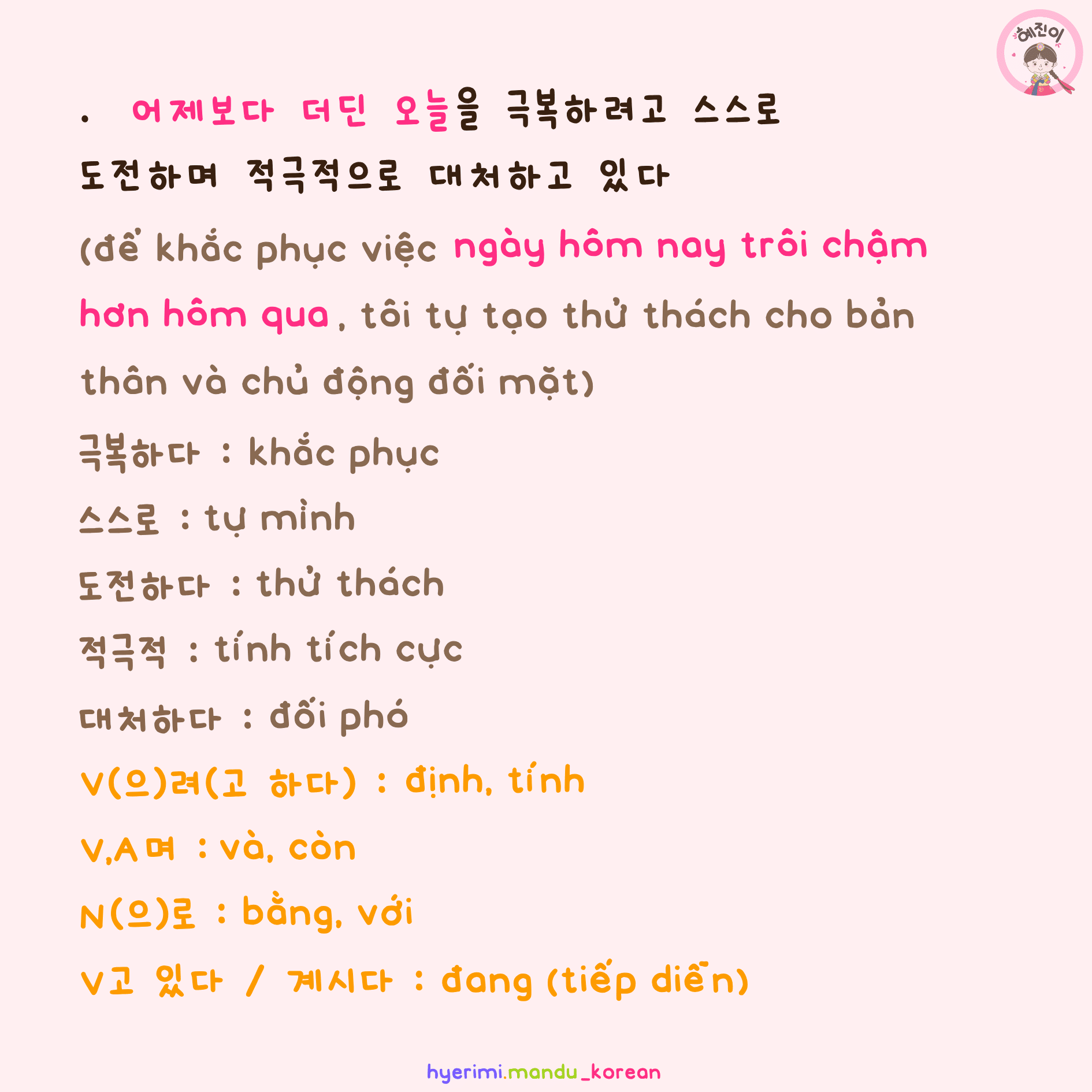 . 어제보다 더딘 오늘을 극복하려고 스스로 도전하며 적극적으로 대처하고 있다