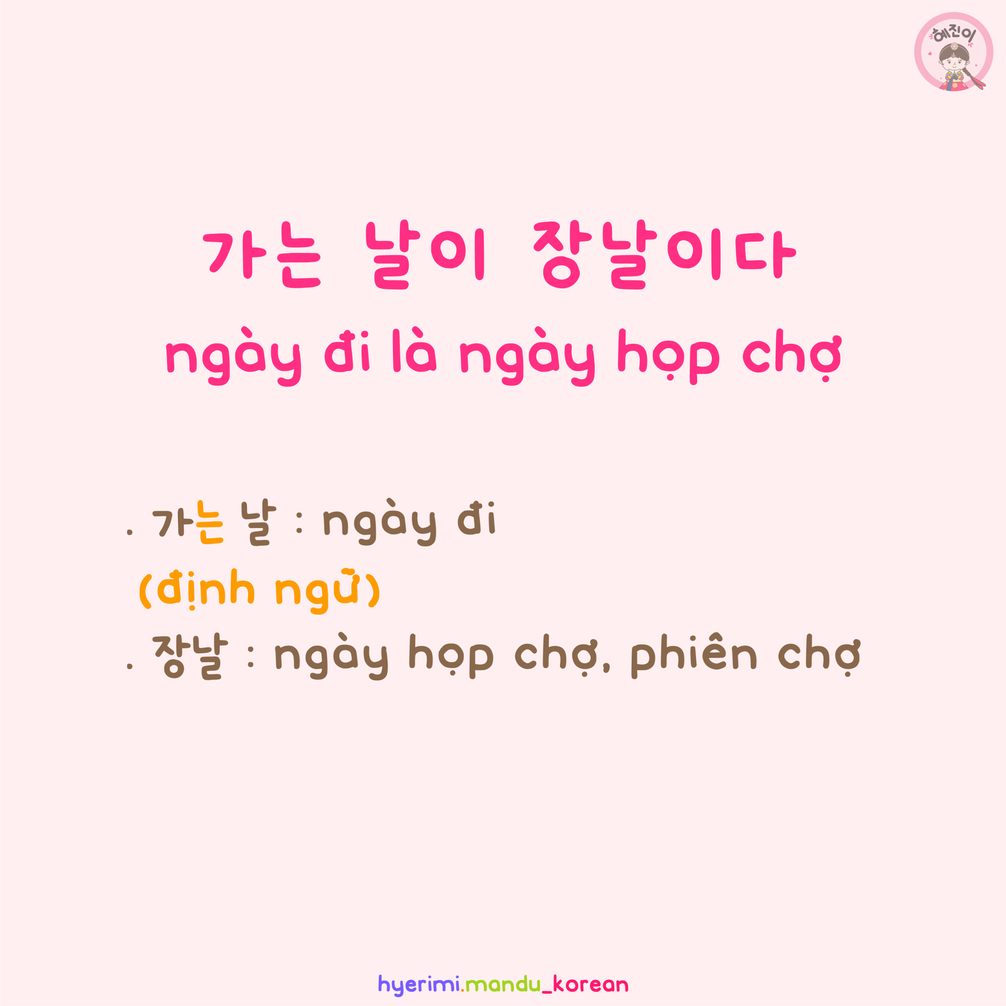 . 가는 날 : ngày đi (định ngữ) . 장날 : ngày họp chợ, phiên chợ