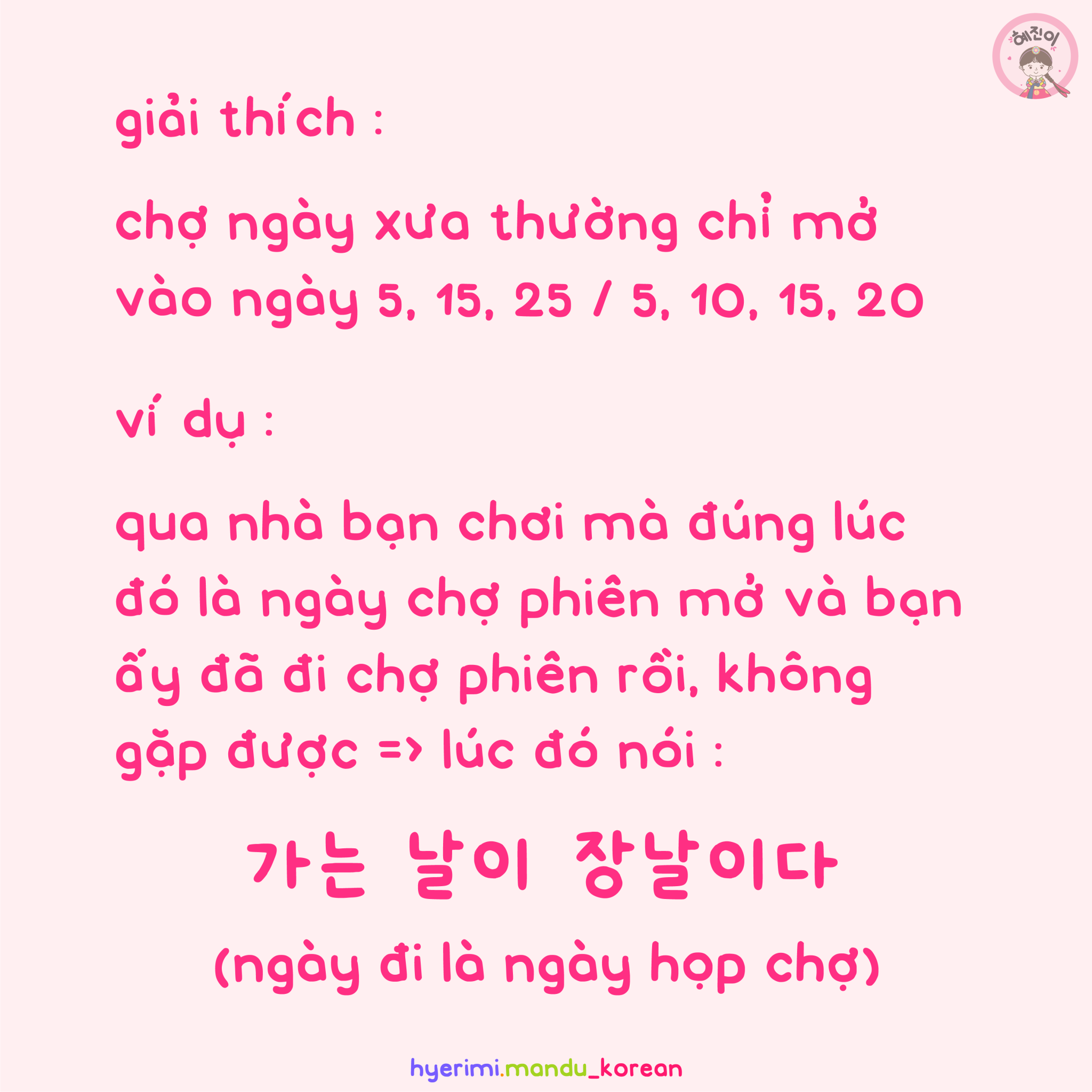 ví dụ : qua nhà bạn chơi mà đúng lúc đó là ngày chợ phiên mở và bạn ấy đã đi chợ phiên rồi, không gặp được = lúc đó nói : 가는 날이 장날이다 (ngày đi là ngày họp chợ)