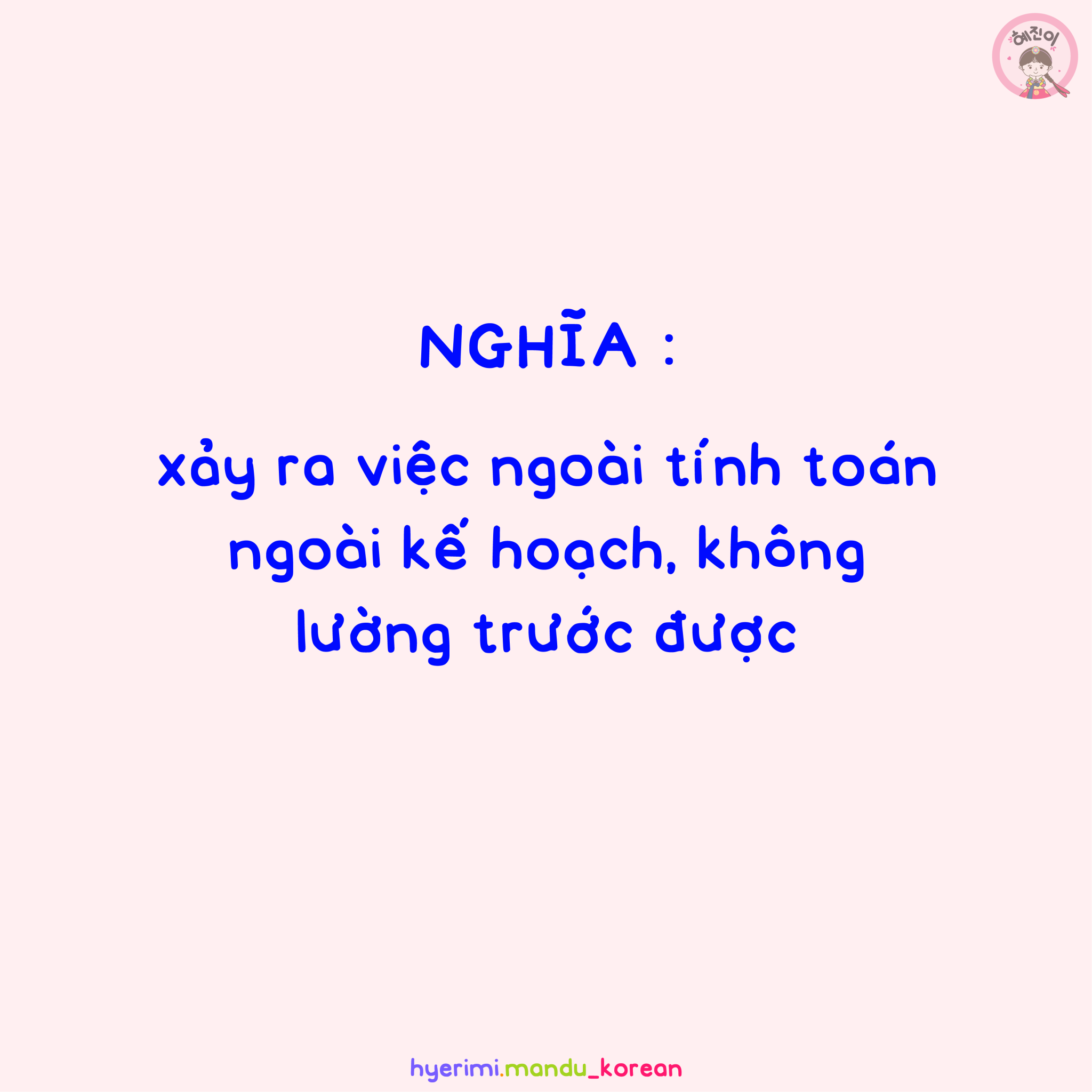 NGHĨA : xảy ra việc ngoài tính toán ngoài kế hoạch, không lường trước được