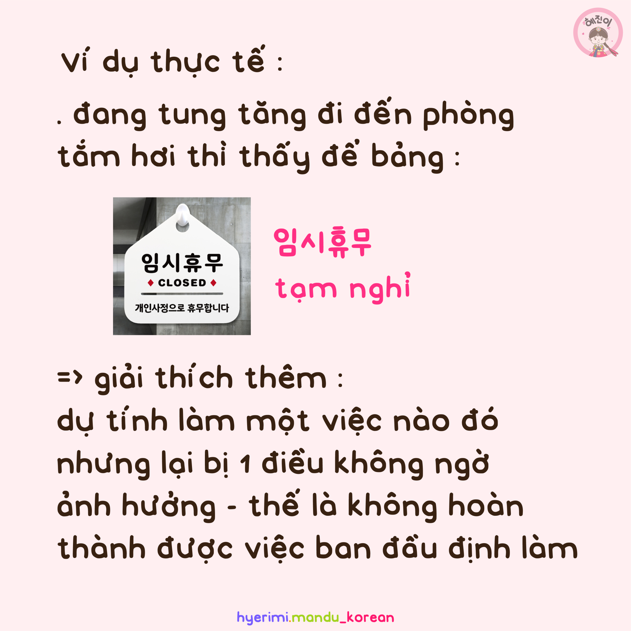 ví dụ thực tế : . đang tung tăng đi đến phòng tắm hơi thì thấy để bảng : 임시휴무 : tạm nghỉ