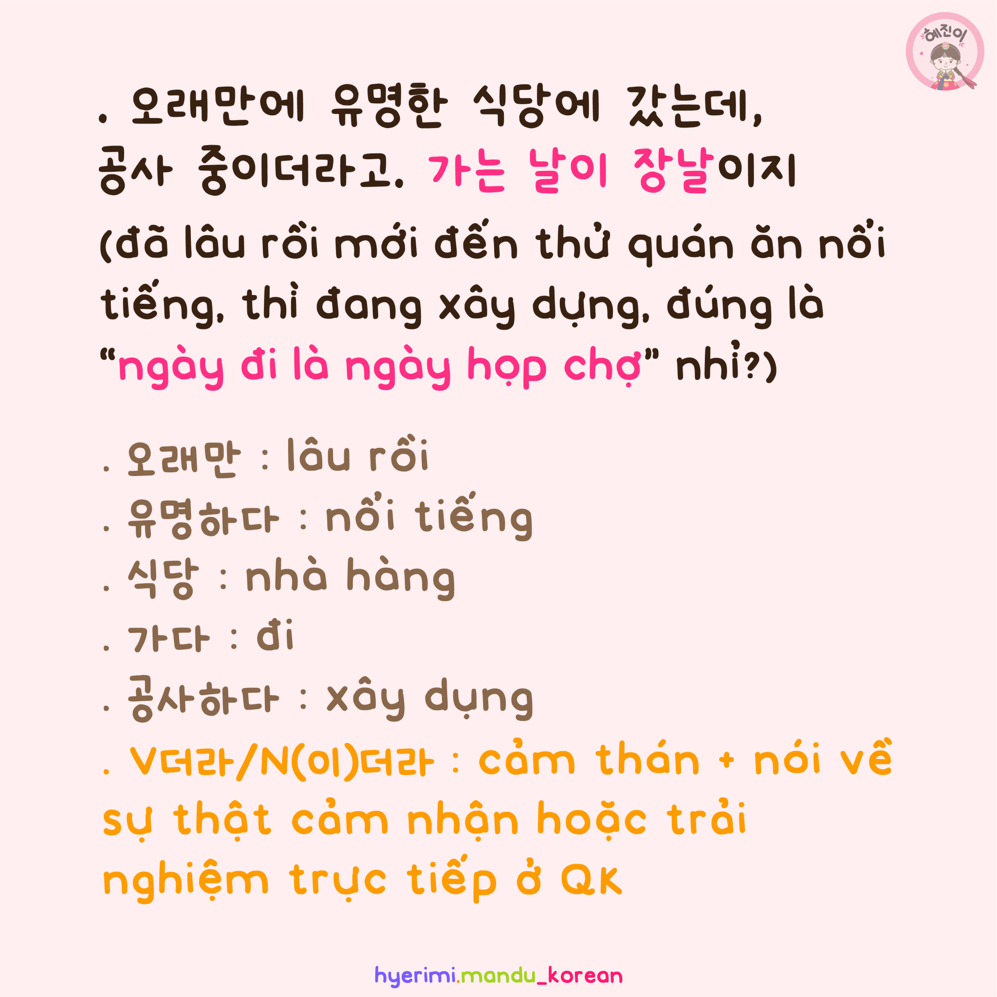 . 오랜만 : lâu rồi . 유명하다 : nổi tiếng . 식당 : nhà hàng . 가다 : đi . 공사하다 : xây dựng . V더라/N(이)더라 : cảm thán + nói về sự thật cảm nhận hoặc trải nghiệm trực tiếp ở QK