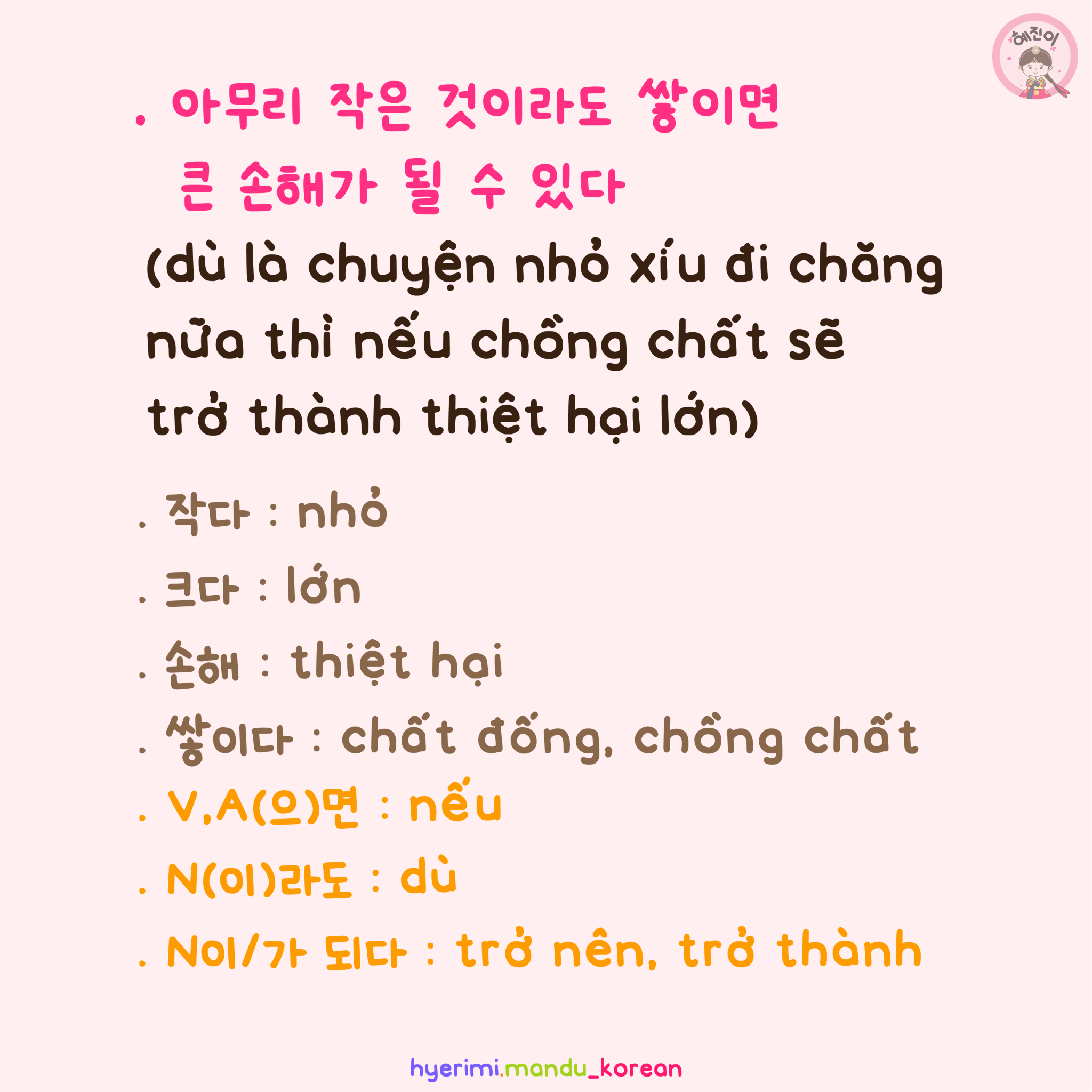 . 작다 : nhỏ . 크다 : lớn . 손해 : thiệt hại . 쌓이다 : chất đống, chồng chất . V,A(으)면 : nếu . N(이)라도 : dù . N이/가 되다 : trở nên, trở thành