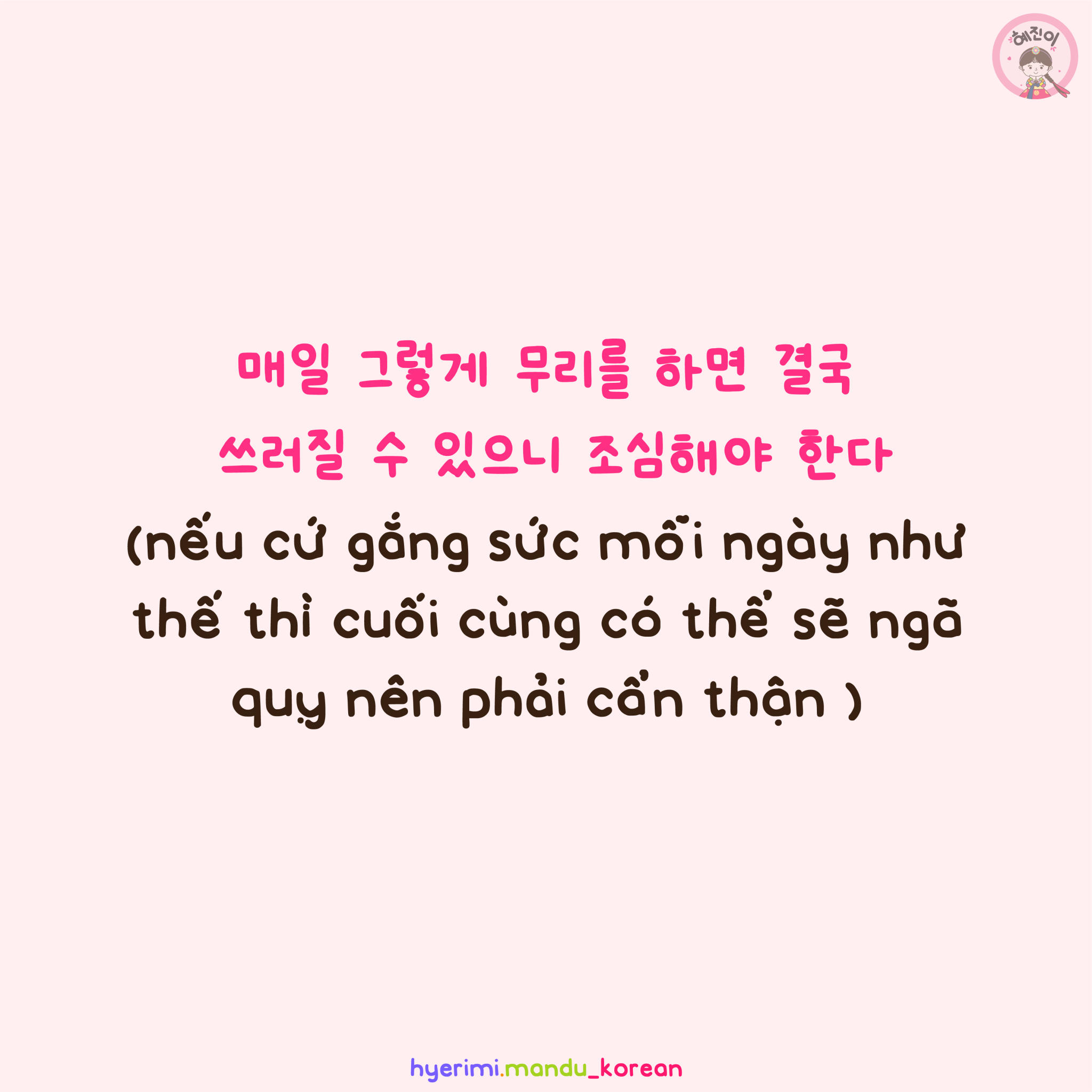 매일 그렇게 무리를 하면 결국 쓰러질 수 있으니 조심해야 한다 (nếu cứ gắng sức mỗi ngày như thể thì cuối cùng có thể sẽ ngã quỵ nên phải cẩn thận)