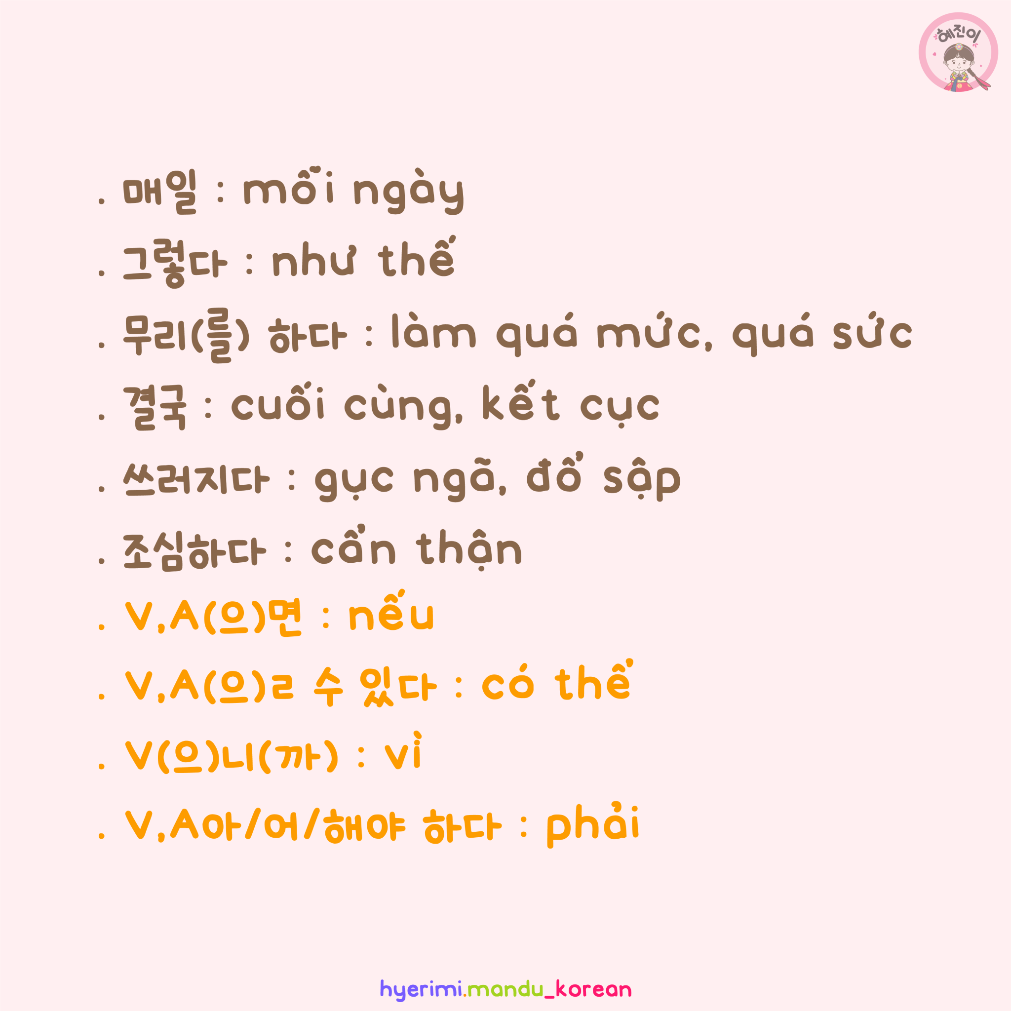 . 매일 : mỗi ngày . 그렇다 : như thế . 무리(를) 하다 : làm quá mức, quá sức . 결국 : cuối cùng, kết cục . 쓰러지다 : gục ngã, đổ sập . 조심하다 : cẩn thận . V,A(으)면 : nếu . V,A(으)ㄹ 수 있다 : có thể . V(으)니(까) : vì . V,A아/어/해야 하다 : phải