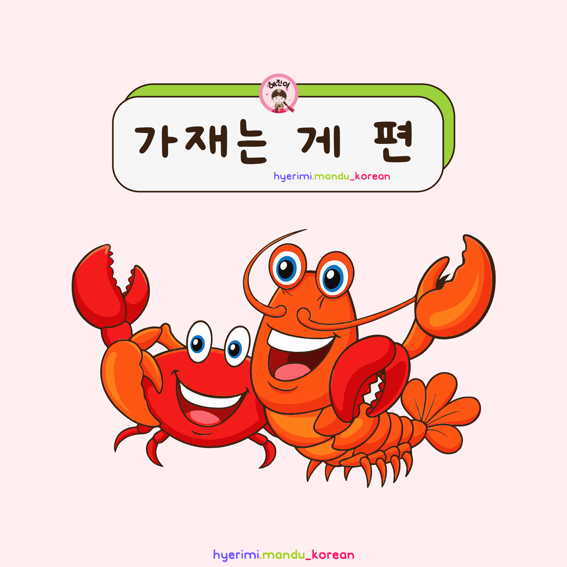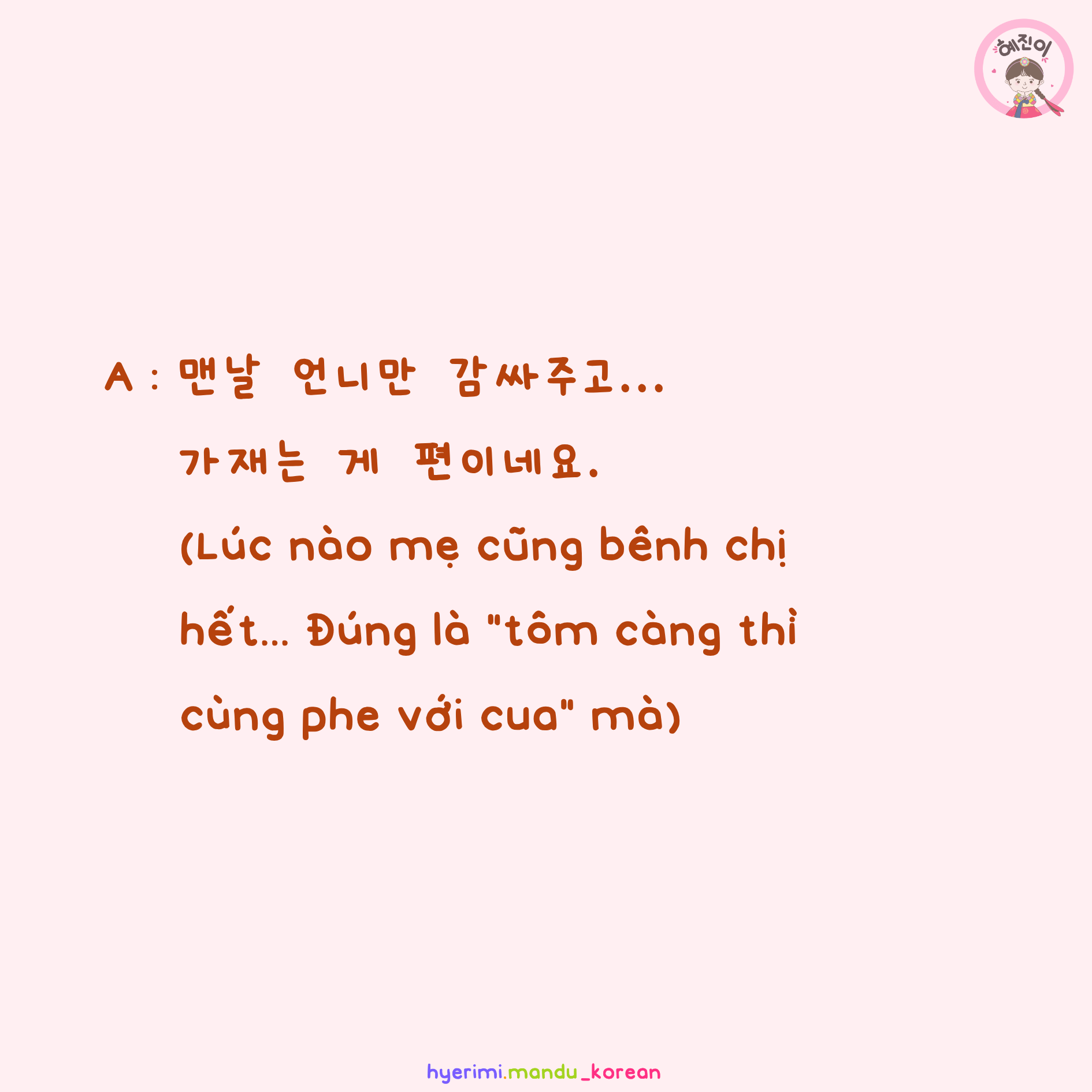 A : 맨날 언니만 감싸주고... 가재는 게 편이네요. (Lúc nào mẹ cũng bênh chị hết... Đúng là "tôm càng thì cùng phe với cua" mà)
