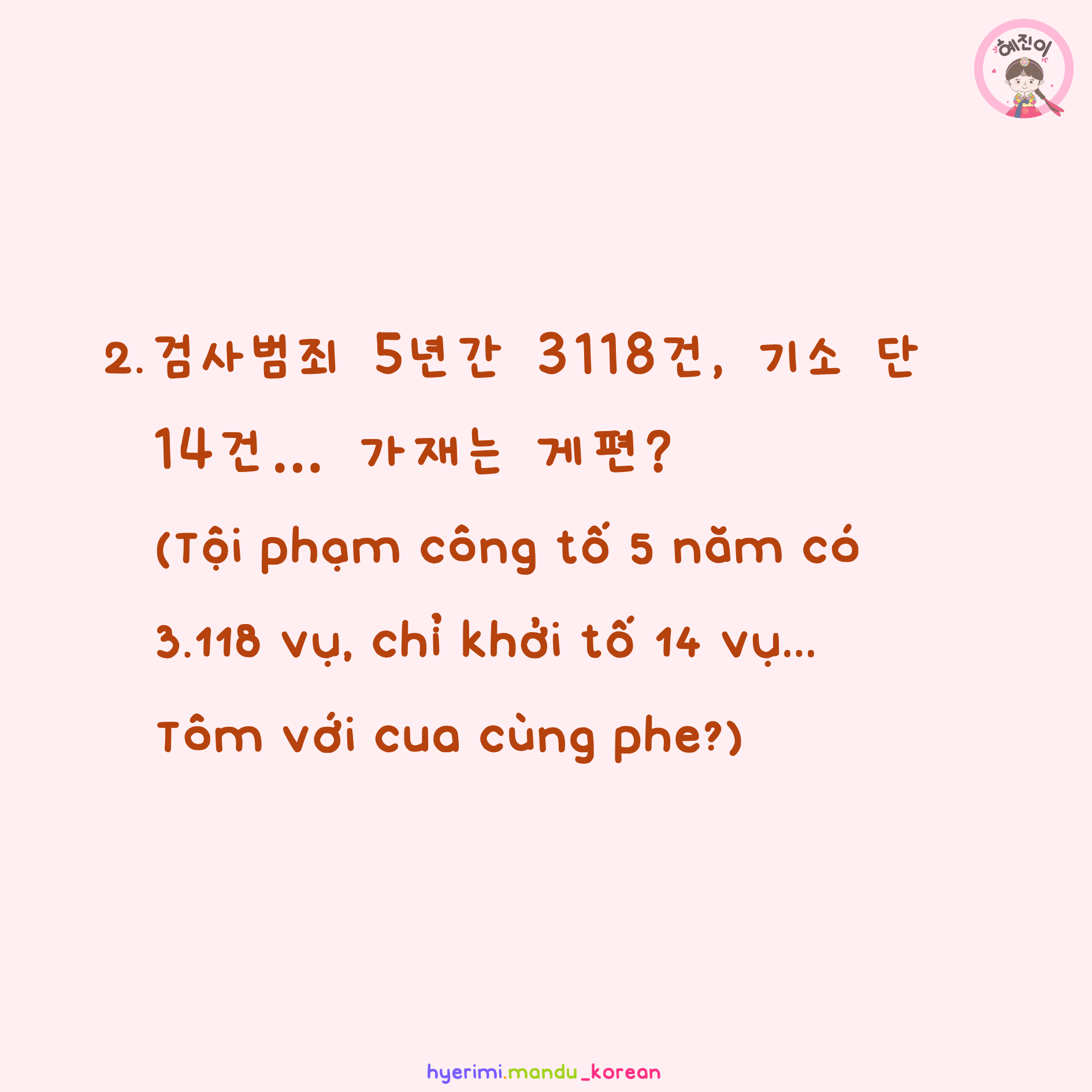 2. 검사범죄 5년간 3118건, 기소 단 14건… 가재는 게편? (Tội phạm công tố 5 năm có 3.118 vụ, chỉ khởi tố 14 vụ… Tôm với cua cùng phe?)