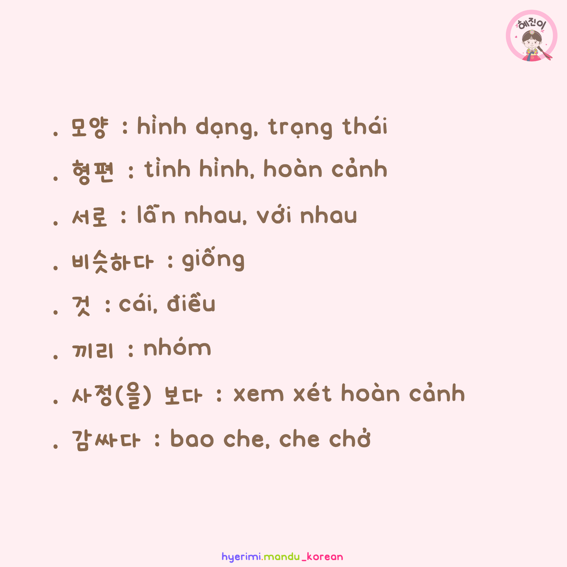 . 모양 : hình dạng, trạng thái . 형편 : tình hình, hoàn cảnh . 서로 : lẫn nhau, với nhau . 비슷하다 : giống . 것 : cái, điều . 끼리 : nhóm . 사정(을) 보다 : xem xét hoàn cảnh . 감싸다 : bao che, che chở