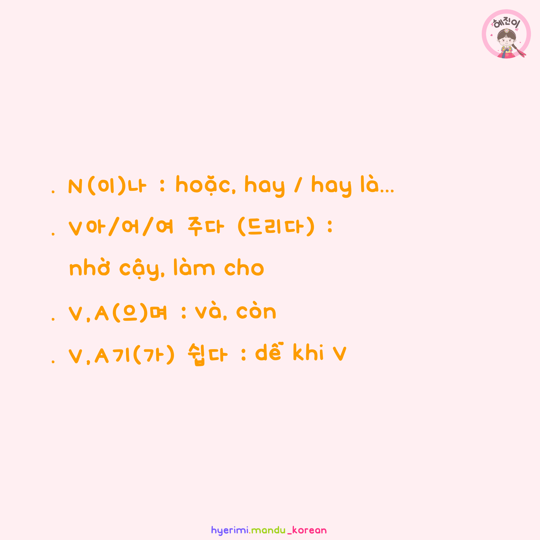 . N(이)나 : hoặc, hay / hay là... . V아/어/여 주다 (드리다) : nhờ cậy, làm cho . V,A(으)며 : và, còn . V기(가) 쉽다 : dễ khi V