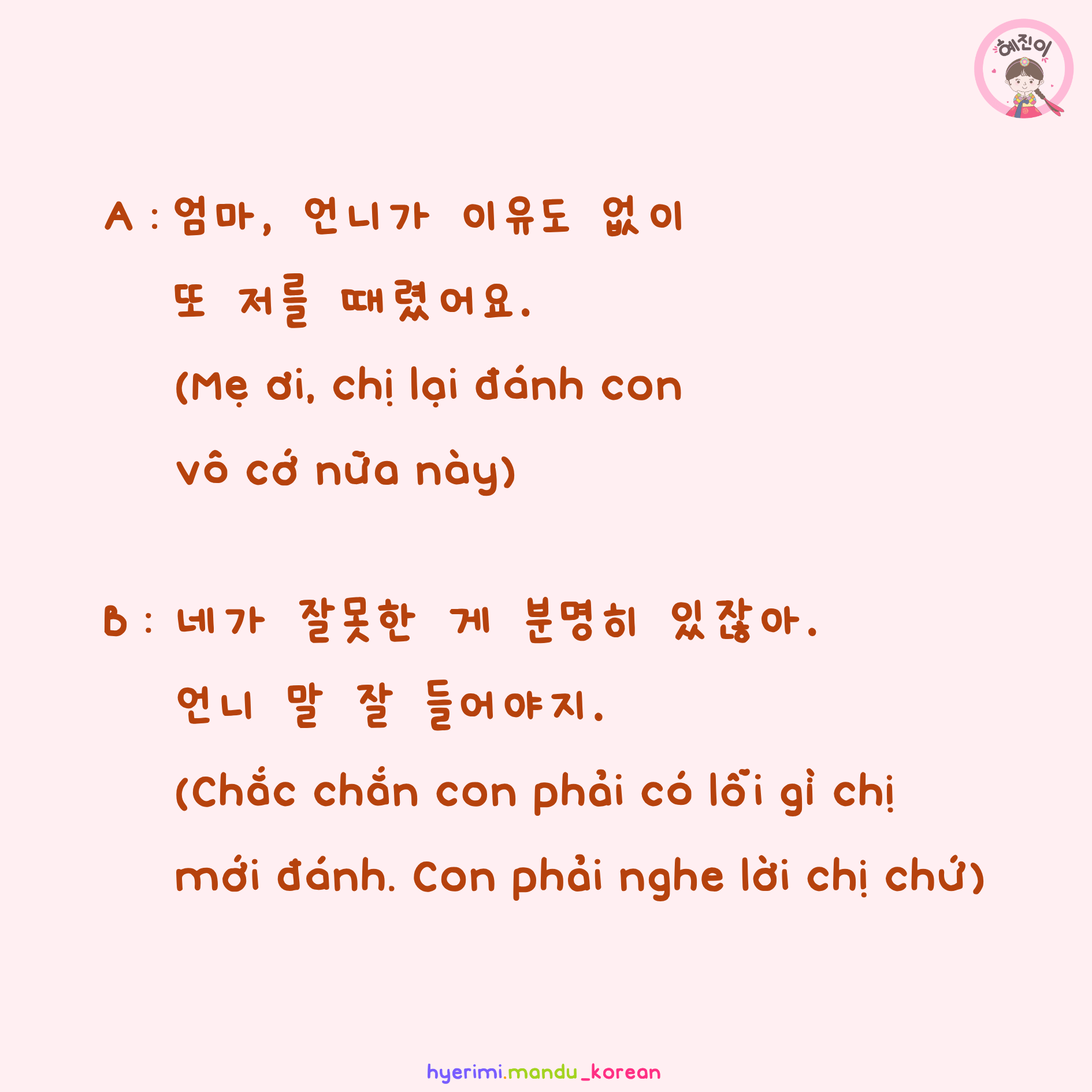A : 엄마, 언니가 이유도 없이 또 저를 때렸어요. (Mẹ ơi, chị lại đánh con vô cớ nữa này)