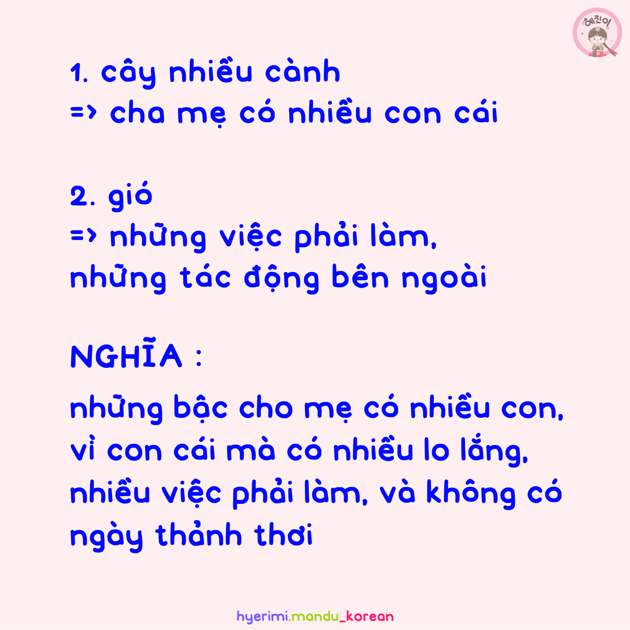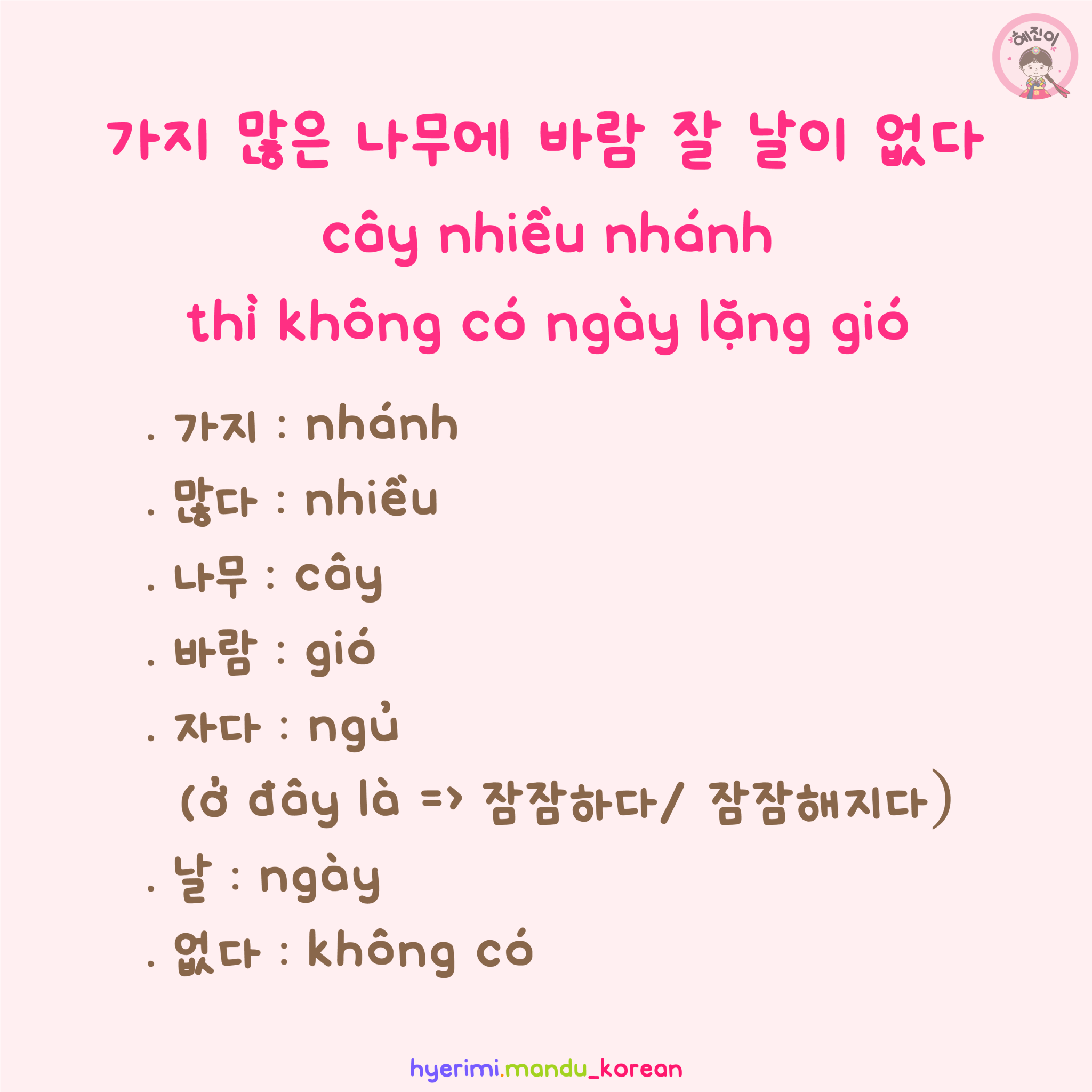 . 가지 : nhánh . 많다 : nhiều . 나무 : cây . 바람 : gió . 자다 : ngủ (ở đây là => 잠잠하다/ 잠잠해지다) . 날 : ngày . 없다 : không có