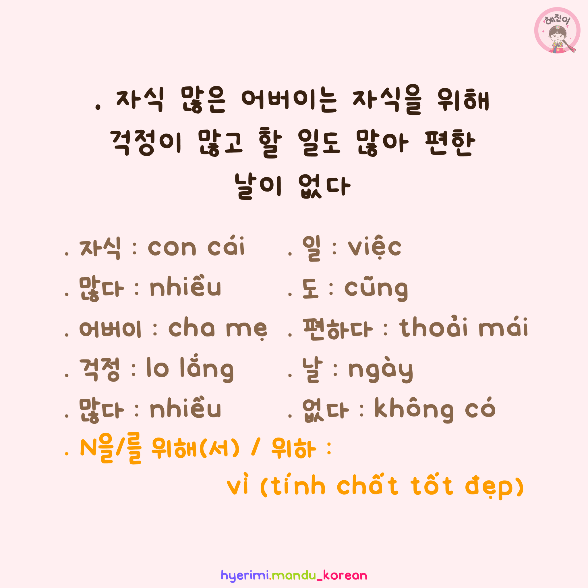 . 자식 : con cái . 많다 : nhiều . 어버이 : cha mẹ . 걱정 : lo lắng . 많다 : nhiều . 일 : việc . 도 : cũng . 편하다 : thoải mái . 날 : ngày . 없다 : không có . N을/를 위해(서)/ 위하 : vì (tính chất tốt đẹp)