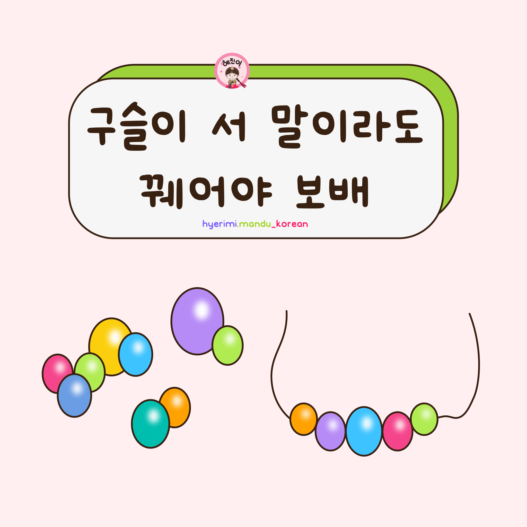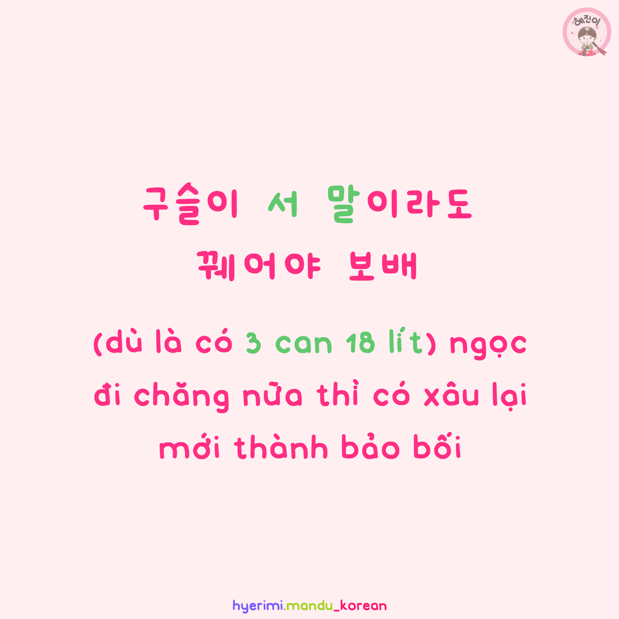 . 구슬 : hạt, bi, viên . 서말 = 54 lít -> 서 = 셋 : 3 -> 말 : can -> thùng gỗ (18 lít) => 3 can (3 x 18) = 54 lít . 꿰다 : xâu kim, xâu dây . 보배 : bảo bối . N(이)라도 : dù . V아/어/해야 (…) : phải V thì mới (…)