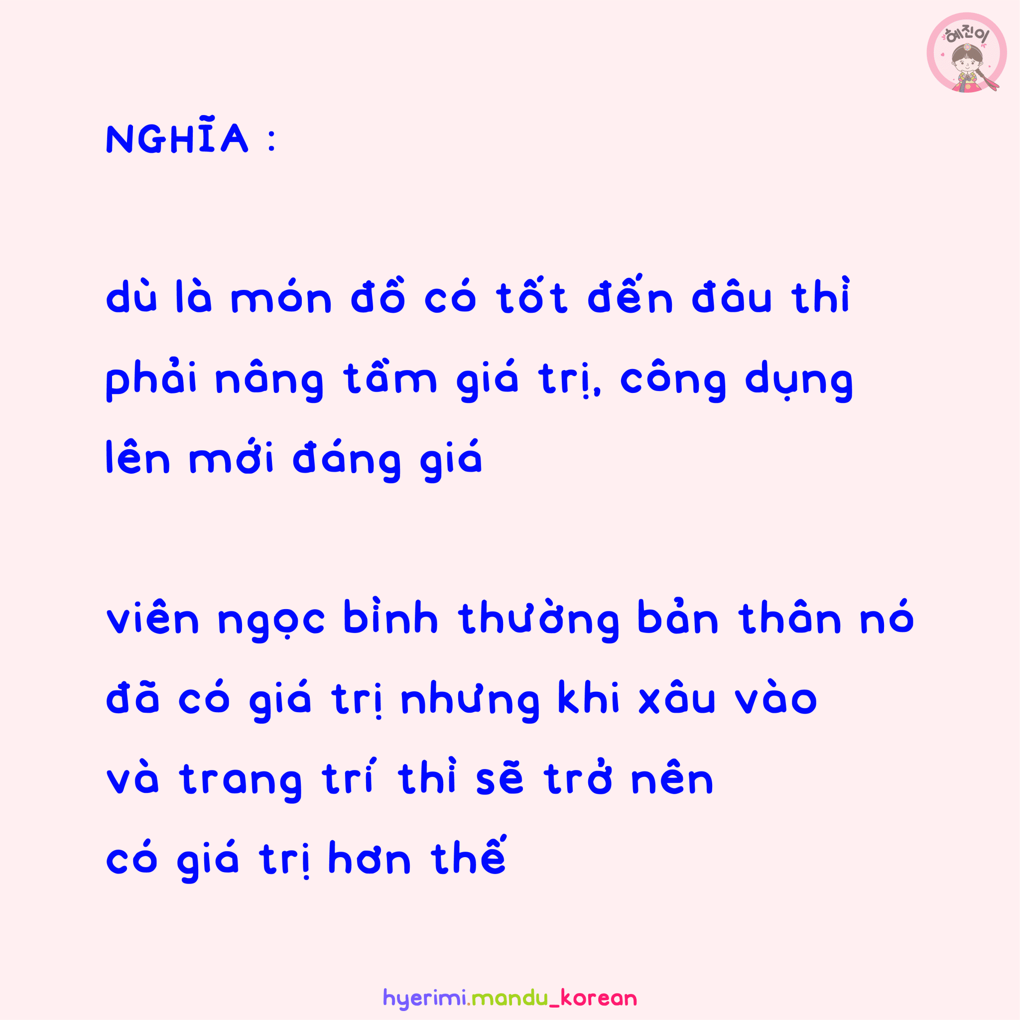[TỤC NGỮ] 구슬이 서 말이라도 꿰어야 보배 [(dù là có 3 can 18 lít) ngọc đi chăng nữa thì có xâu lại mới thành bảo bối]