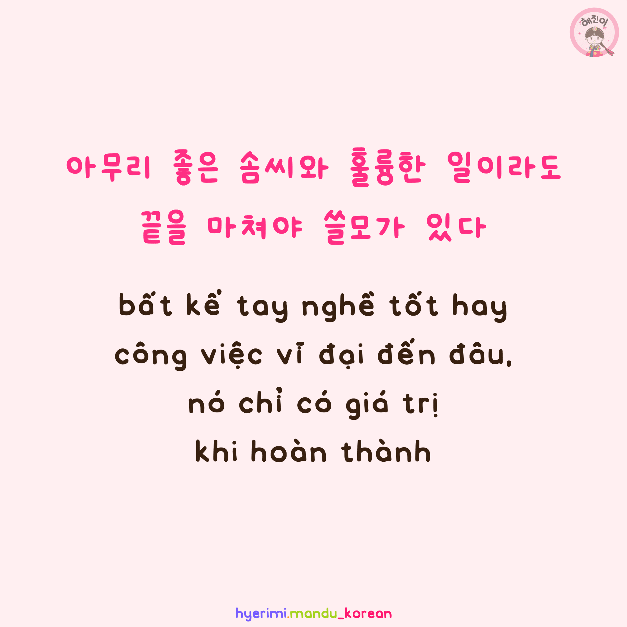 아무리 좋은 솜씨와 훌륭한 일이라도 끝을 마쳐야 쓸모가 있다 bất kể tay nghề tốt hay công việc vĩ đại đến đâu, nó chỉ có giá trị khi hoàn thành