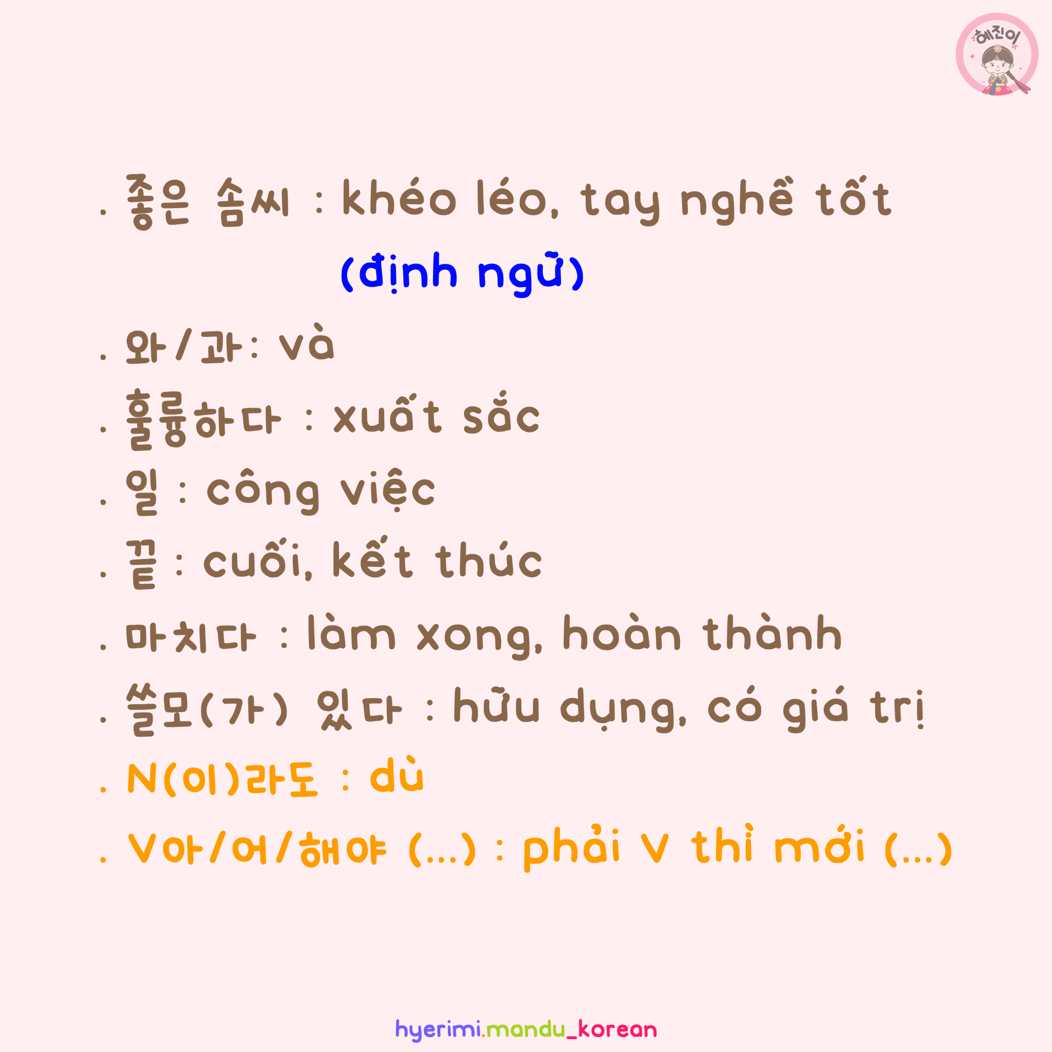 . 좋은 솜씨 : khéo léo, tay nghề tốt (định ngữ) . 와/과 : và . 훌륭하다 : xuất sắc . 일 : công việc . 끝 : cuối, kết thúc . 마치다 : làm xong, hoàn thành . 쓸모(가) 있다 : hữu dụng, có giá trị . N(이)라도 : dù . V아/어/해야 (…) : phải V thì mới (…)