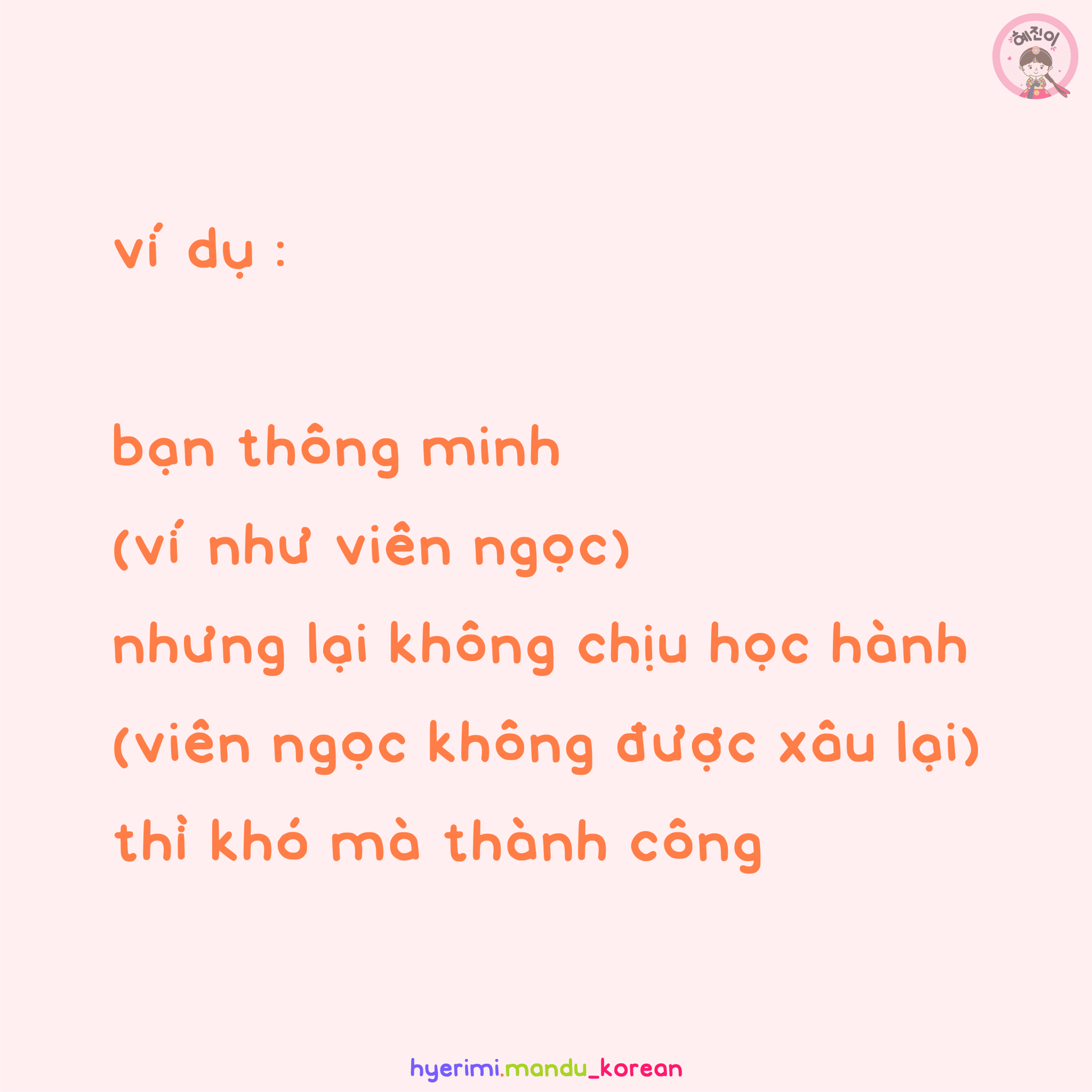 ví dụ : bạn thông minh (ví như viên ngọc) nhưng lại không chịu học hành (viên ngọc không được xâu lại) thì khó mà thành công