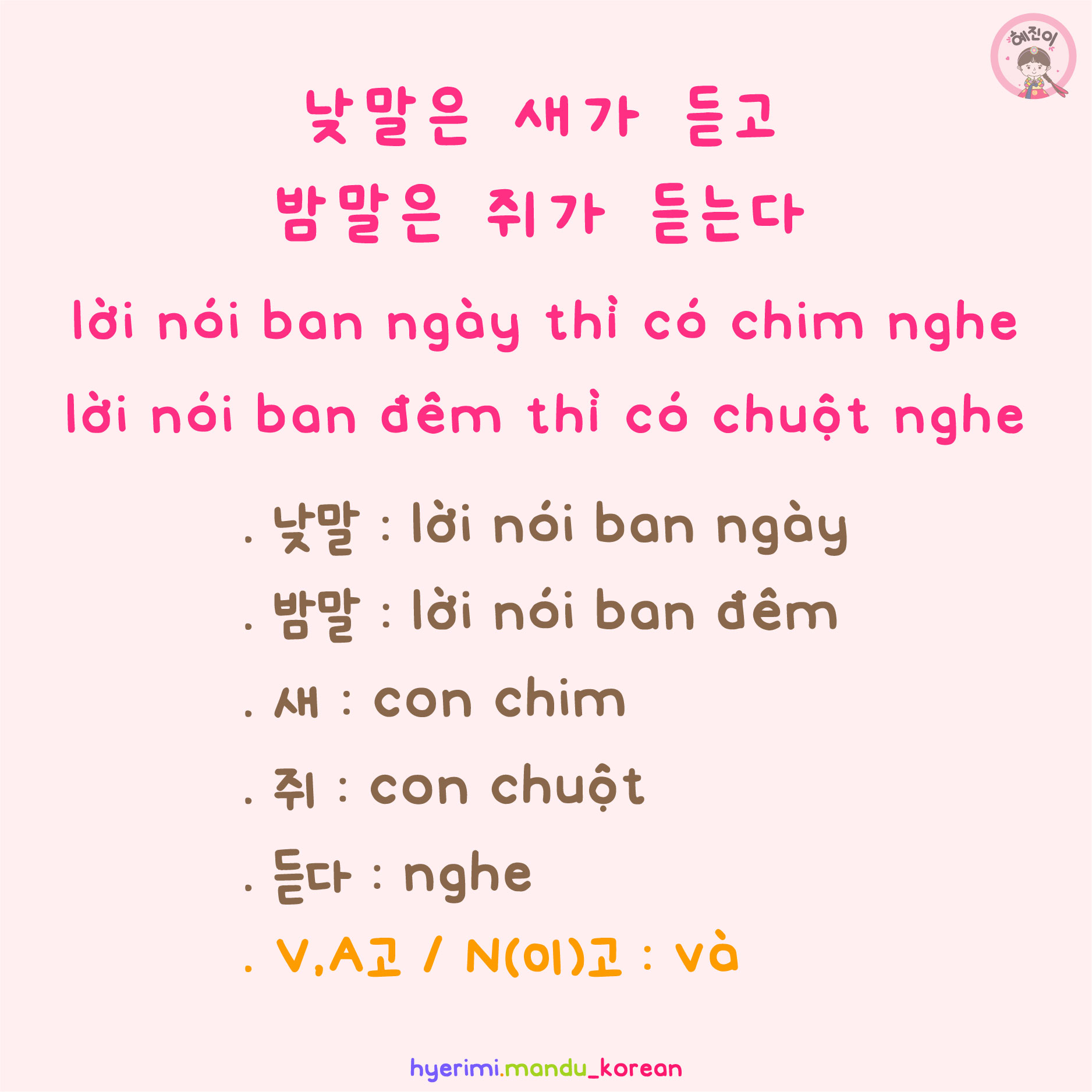 . 낮말 : lời nói ban ngày . 밤말 : lời nói ban đêm . 새 : con chim . 쥐 : con chuột . 듣다 : nghe . V,A고 / N(이)고 : và
