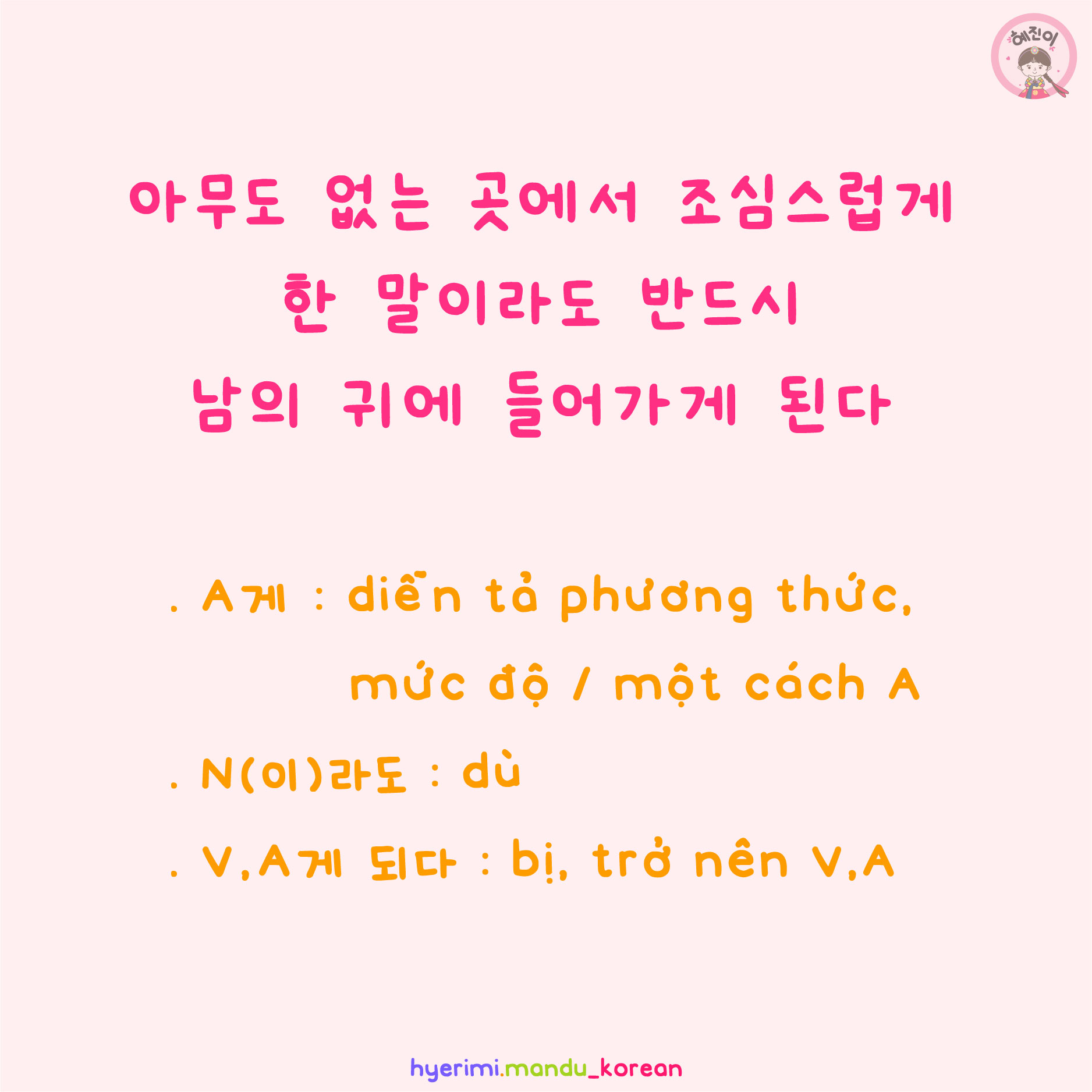 . A게 : diễn tả phương thức, mức độ / một cách A . N(이)라도 : dù . V,A게 되다 : bị, trở nên V,A
