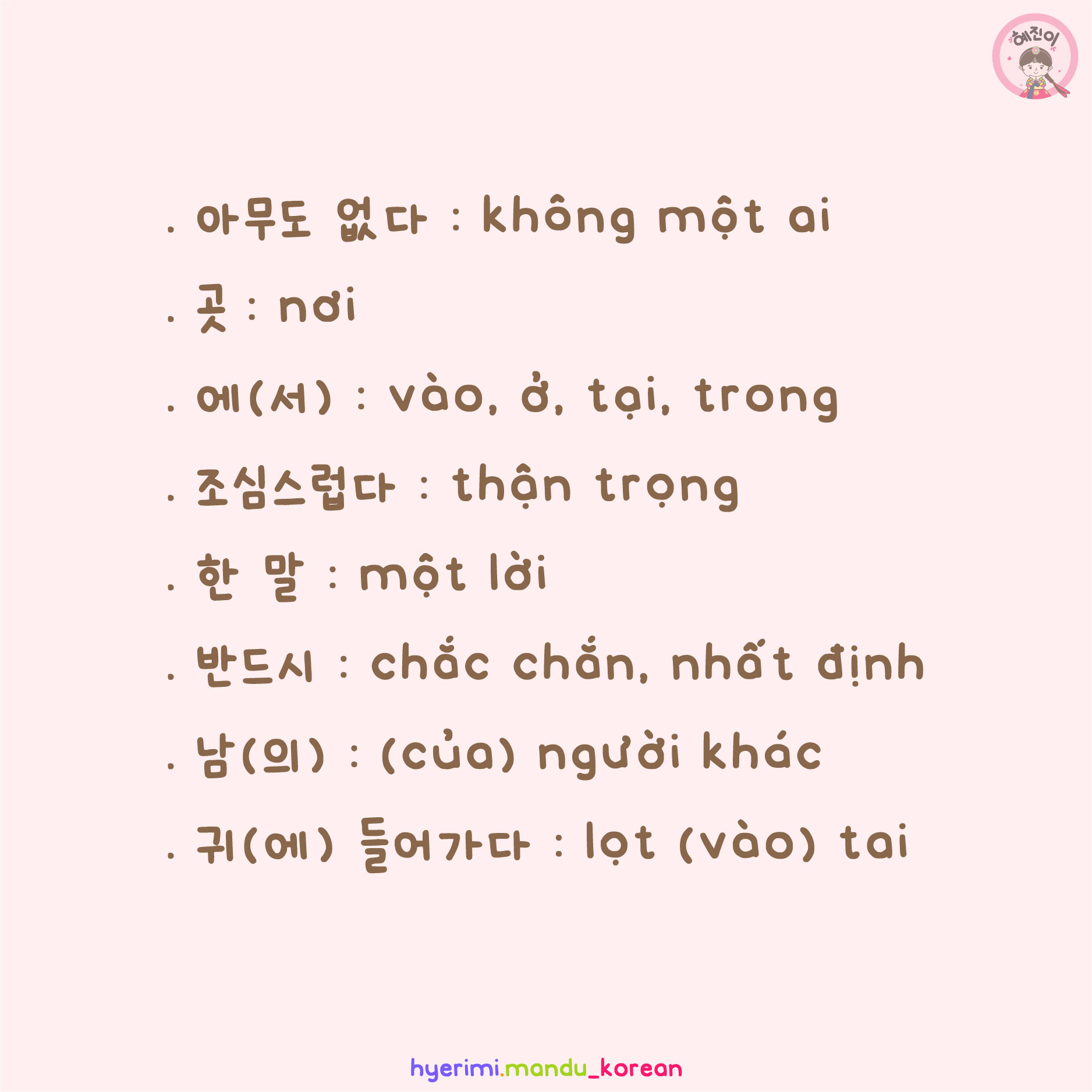 . 아무도 없다 : không một ai . 곳 : nơi . 에(서) : vào, ở, tại, trong . 조심스럽다 : thận trọng . 한 말 : một lời . 반드시 : chắc chắn, nhất định . 남(의) : (của) người khác . 귀(에) 들어가다 : lọt (vào) tai