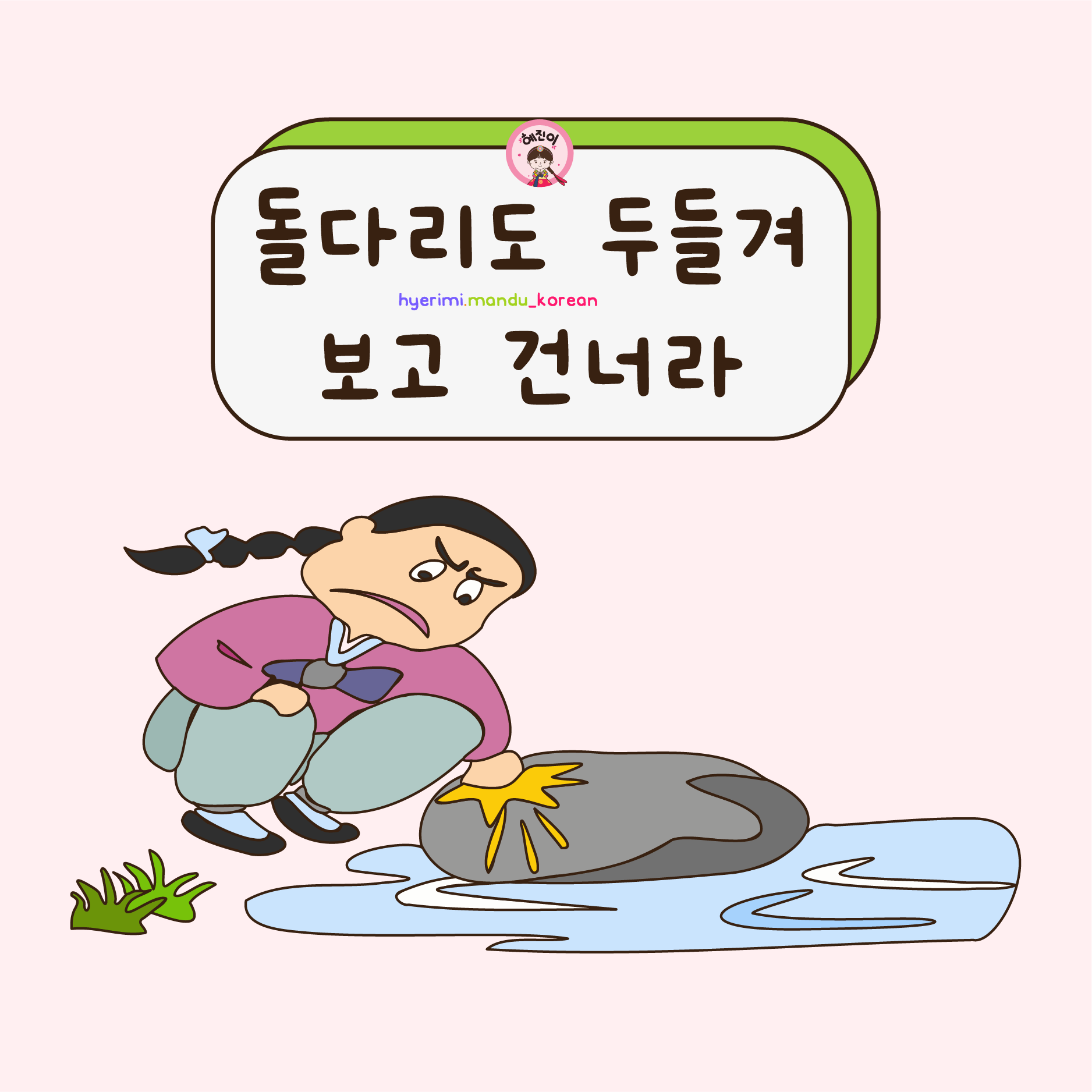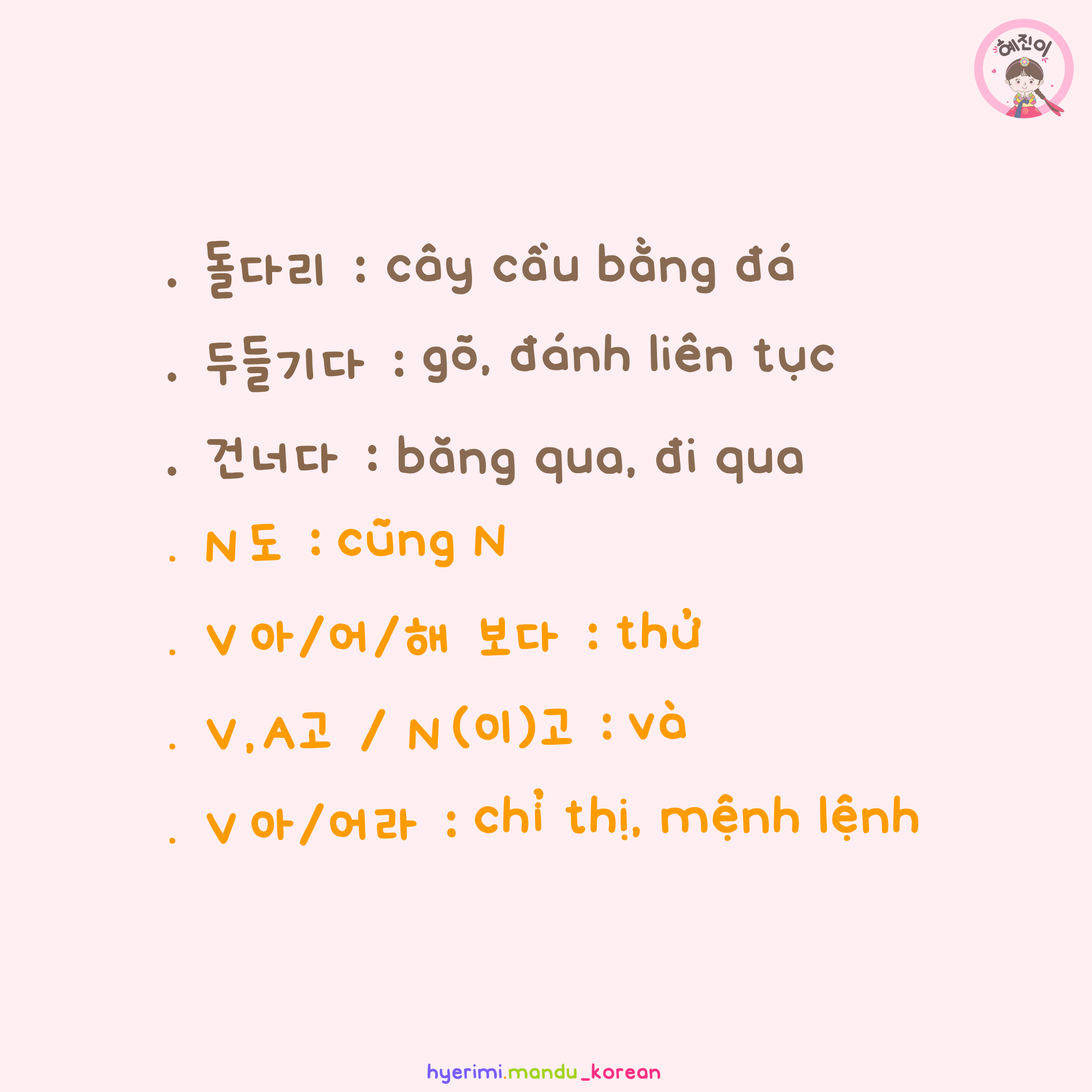 . 돌다리 : cây cầu bằng đá . 두들기다 : gõ, đánh liên tục . 거너다 : băng qua, đi qua . N도 : cũng N . V아/어/해 보다 : thử . V.A고 / N(이)고 : và . V아/어라 : chỉ thị, mệnh lệnh