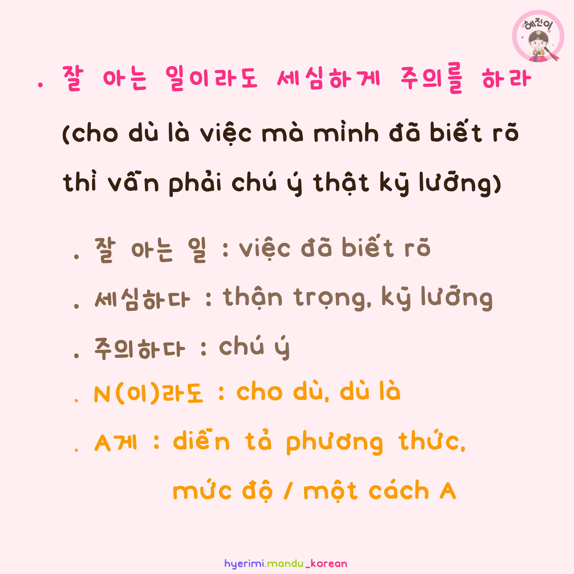 . 잘 아는 일 : việc đã biết rõ (định ngữ) . 세심하다 : thận trọng, kỹ lưỡng . 주의하다 : chú ý . N(이)라도 : cho dù, dù là . A게 : diễn tả phương thức, mức độ / một cách A