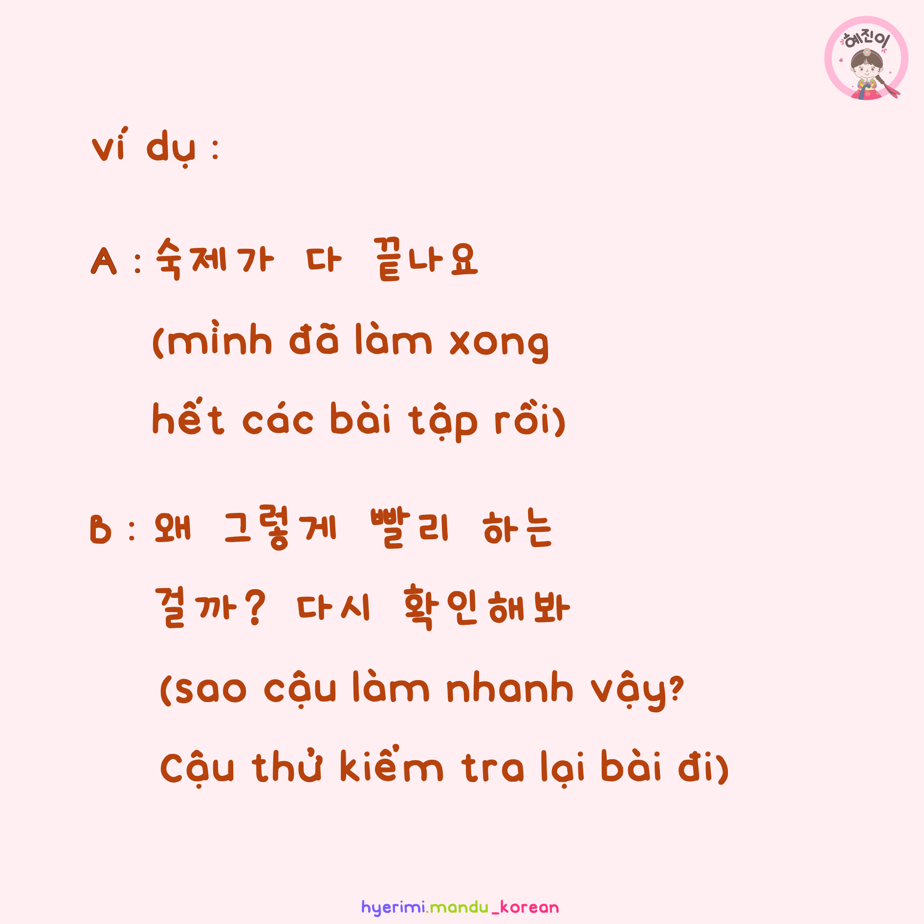 B : 왜 그렇게 빨리 하는 걸까? 다시 확인해봐 (sao cậu làm nhanh vậy? Cậu thử kiểm tra lại bài đi)