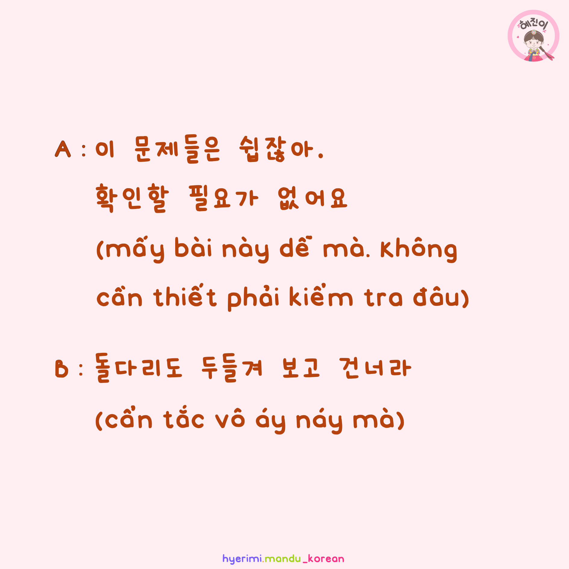 A : 이 문제들은 쉽잖아. 확인할 필요가 없어요 (mấy bài này dễ mà. Không cần thiết phải kiểm tra đâu)