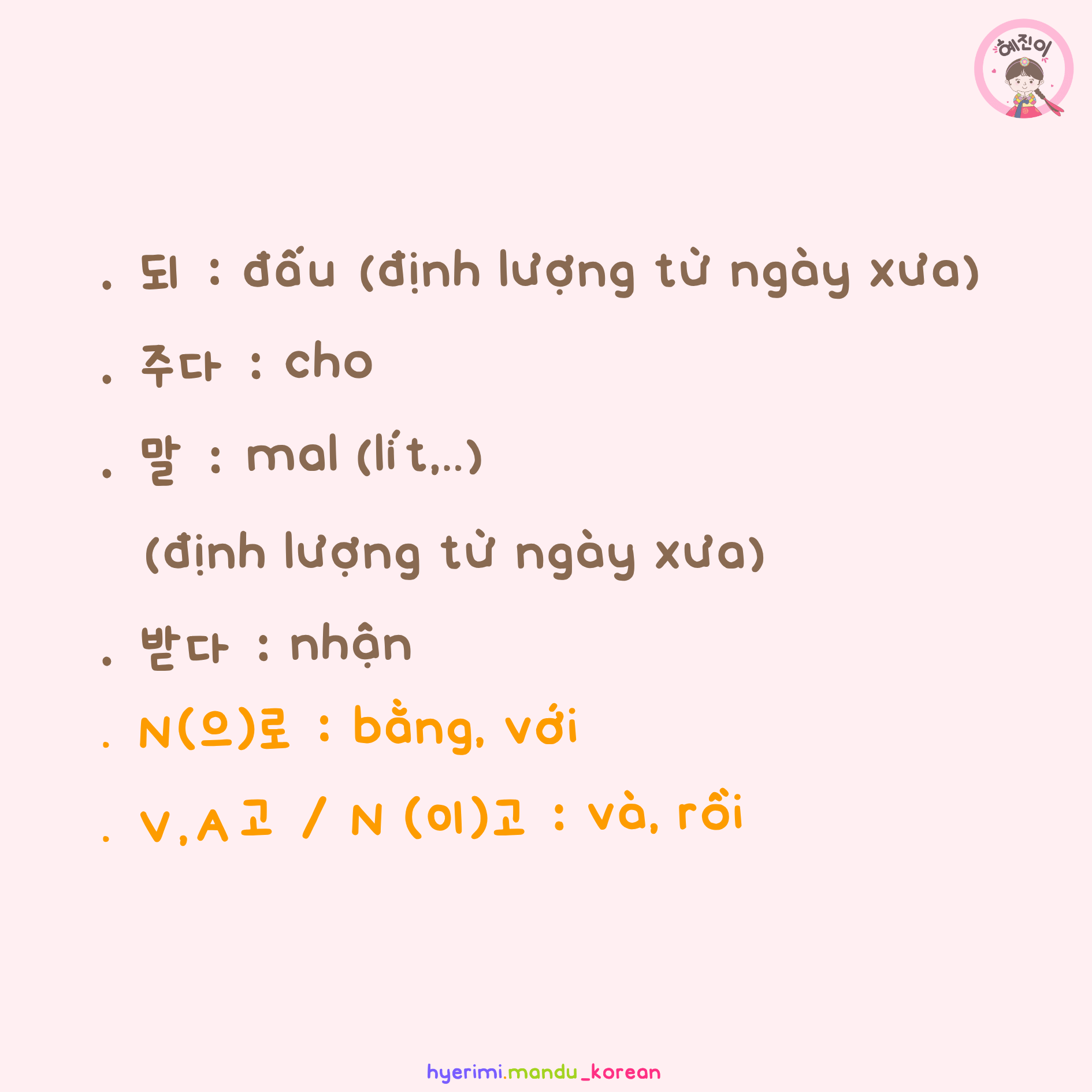 . 되 : đấu (định lượng từ ngày xưa) . 주다 : cho . 말 : giạ, thúng (lít,..) (định lượng từ ngày xưa) . 받다 : nhận . N(으)로 : bằng, với . V,A고 / N(이)고 : và, rồi