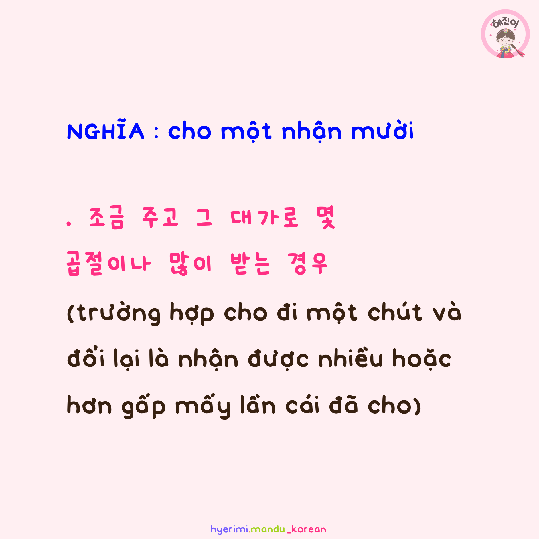 . 조금 주고 그 대가로 몇 곱절이나 많이 받는 경우 (trường hợp cho đi một chút và đổi lại là nhận được nhiều hoặc hơn gấp mấy lần cái đã cho)