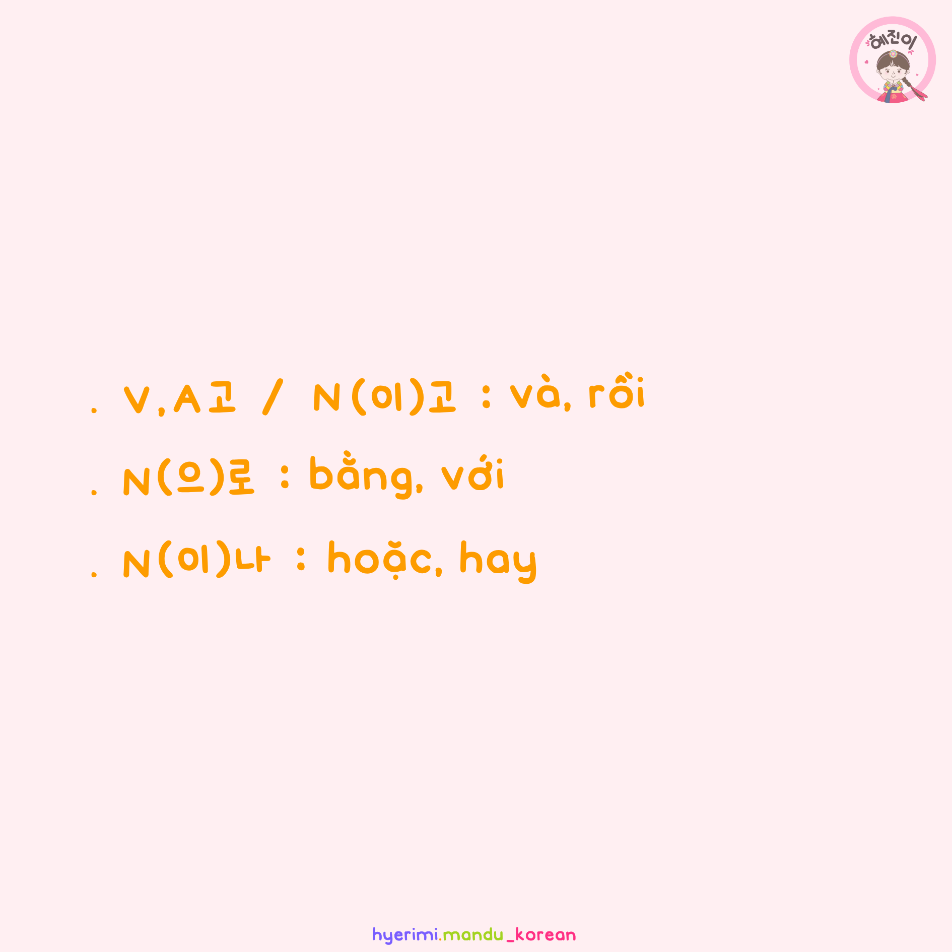 . V,A고 / N(이)고 : và, rồi . N(으)로 : bằng, với . N(이)나 : hoặc, hay