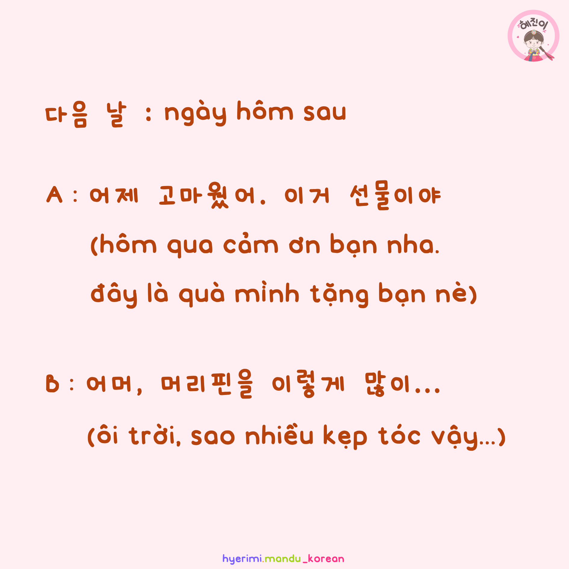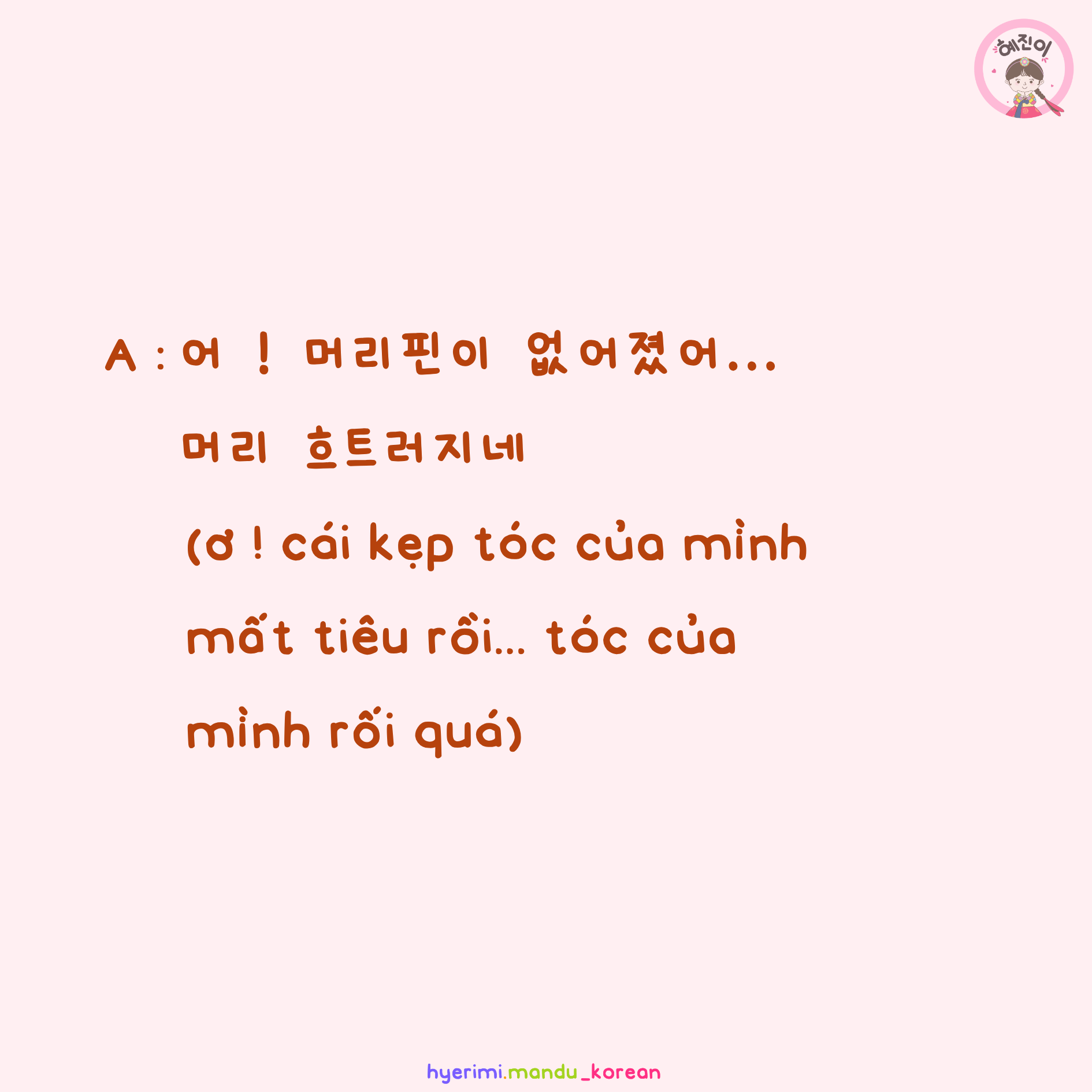 A : 어 ! 머리핀이 없어졌어... 머리 흐트러지네 (ơ ! cái kẹp tóc của mình mất tiêu rồi... tóc của mình rối quá)