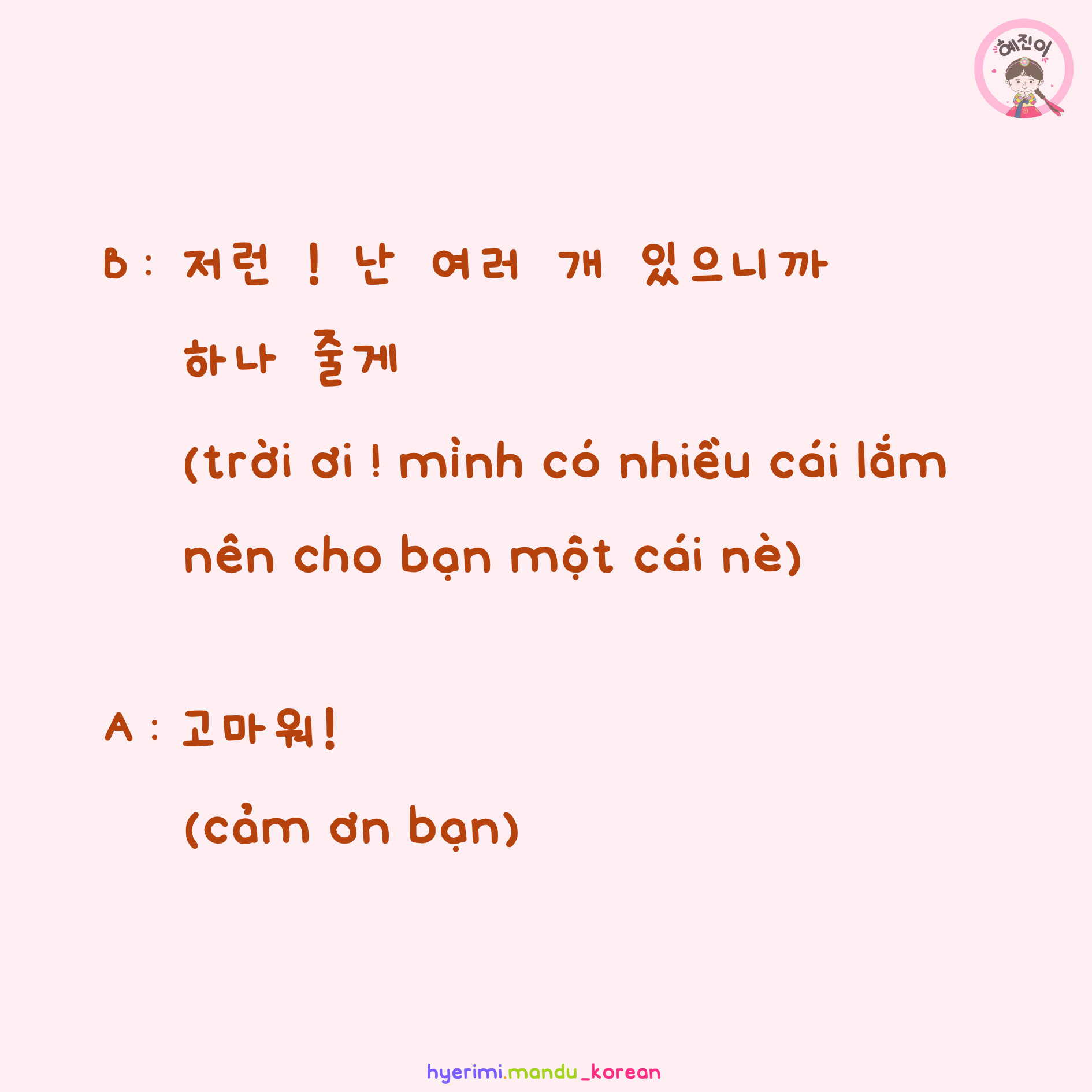 B : 저런 ! 난 여러 개 있으니까 하나 줄게 (trời ơi ! mình có nhiều cái lắm nên cho bạn một cái nè)