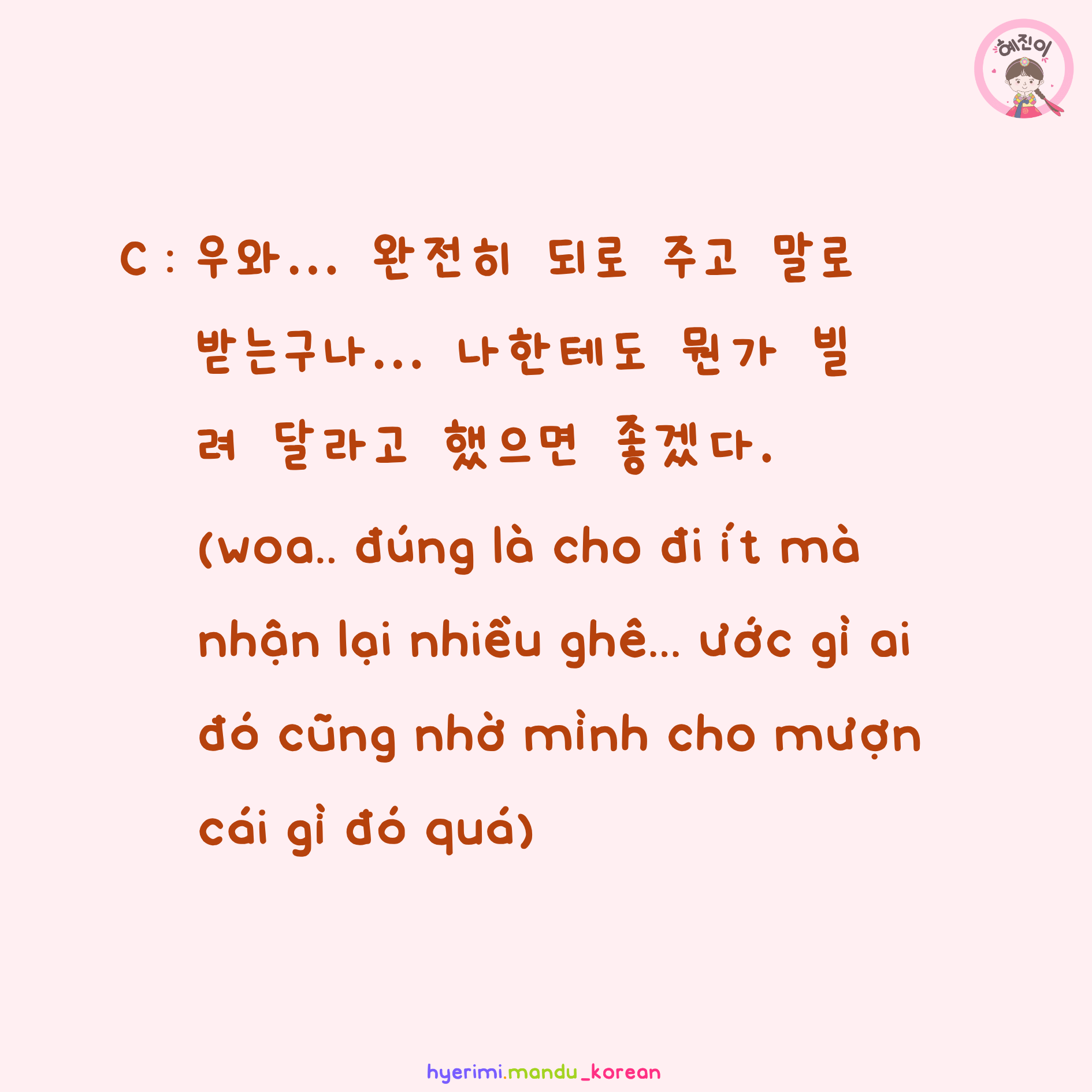 C : 우와... 완전히 되로 주고 말로 받는구나... 나한테도 뭔가 빌려 달라고 했으면 좋겠다. (woa.. đúng là cho đi ít mà nhận lại nhiều ghê... ước gì ai đó cũng nhờ mình cho mượn cái gì đó quá)