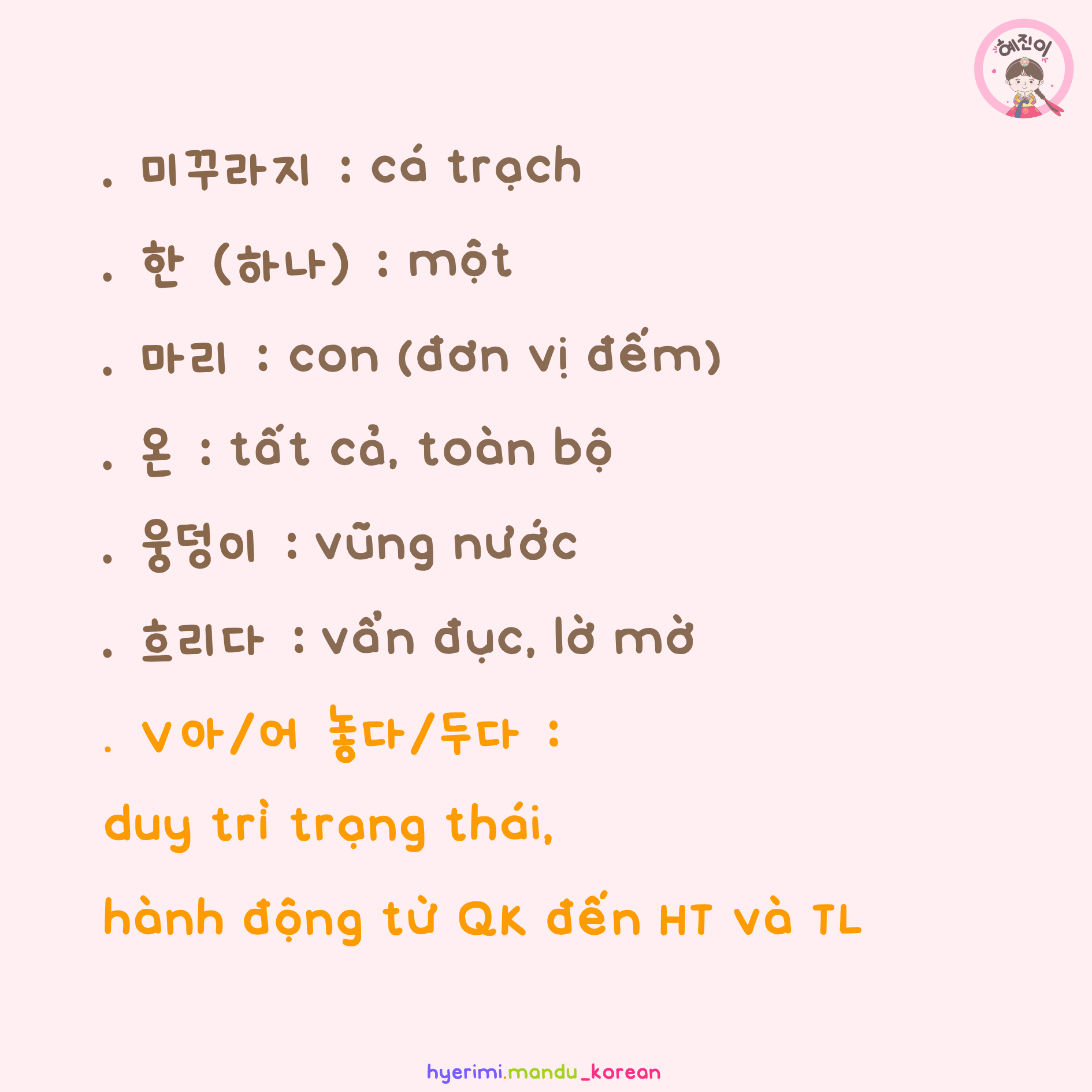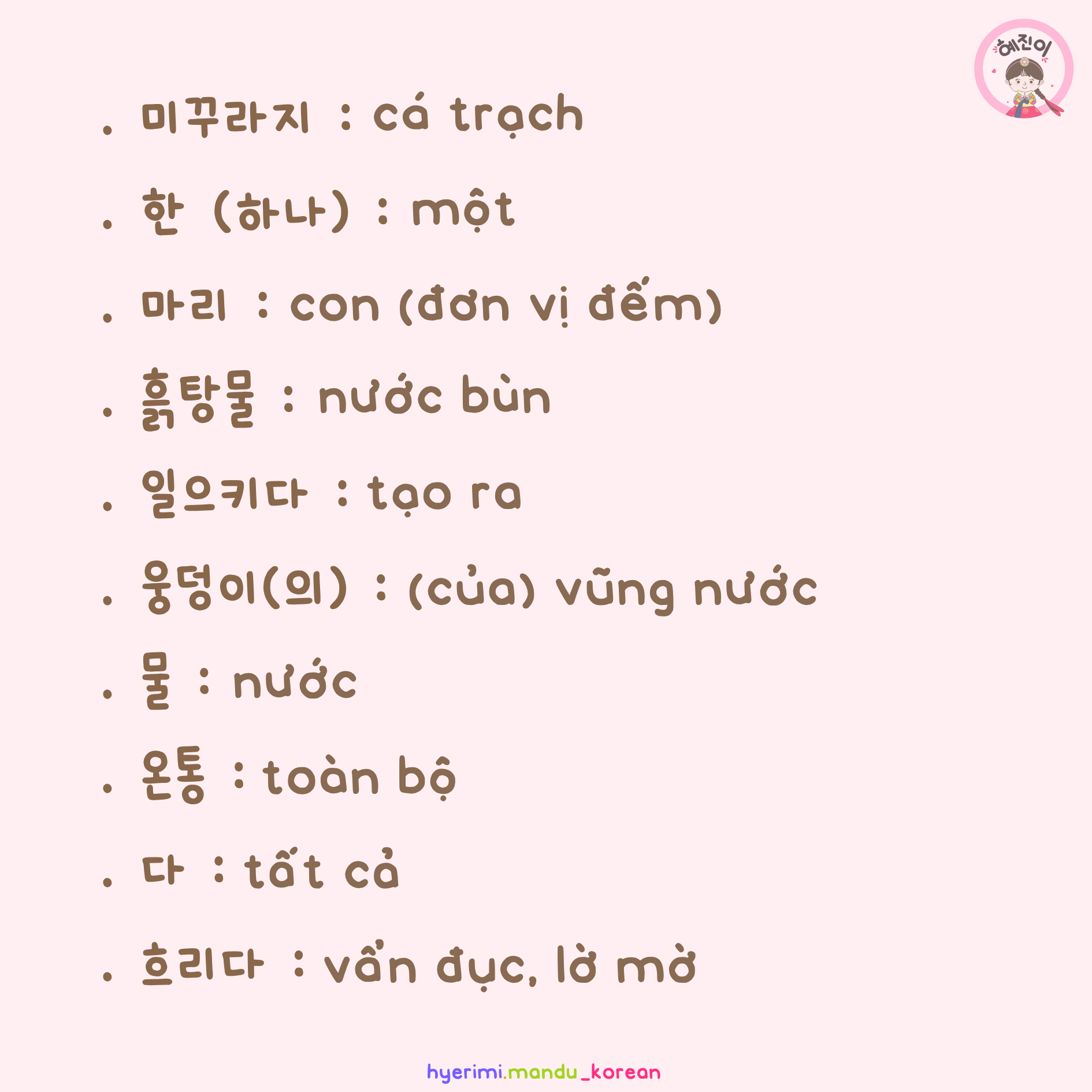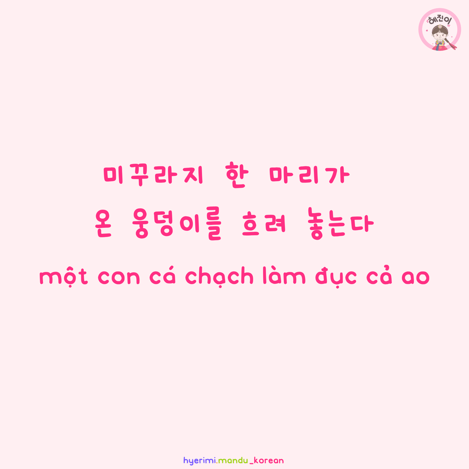 . 미꾸라지 : cá trạch . 한 (하나) : một . 마리 : con (đơn vị đếm) . 온 : tất cả, toàn bộ . 웅덩이 : vũng nước . 흐리다 : vẩn đục, lờ mờ . V아/어 놓다/두다 : duy trì trạng thái, hành động từ QK đến HT và TL