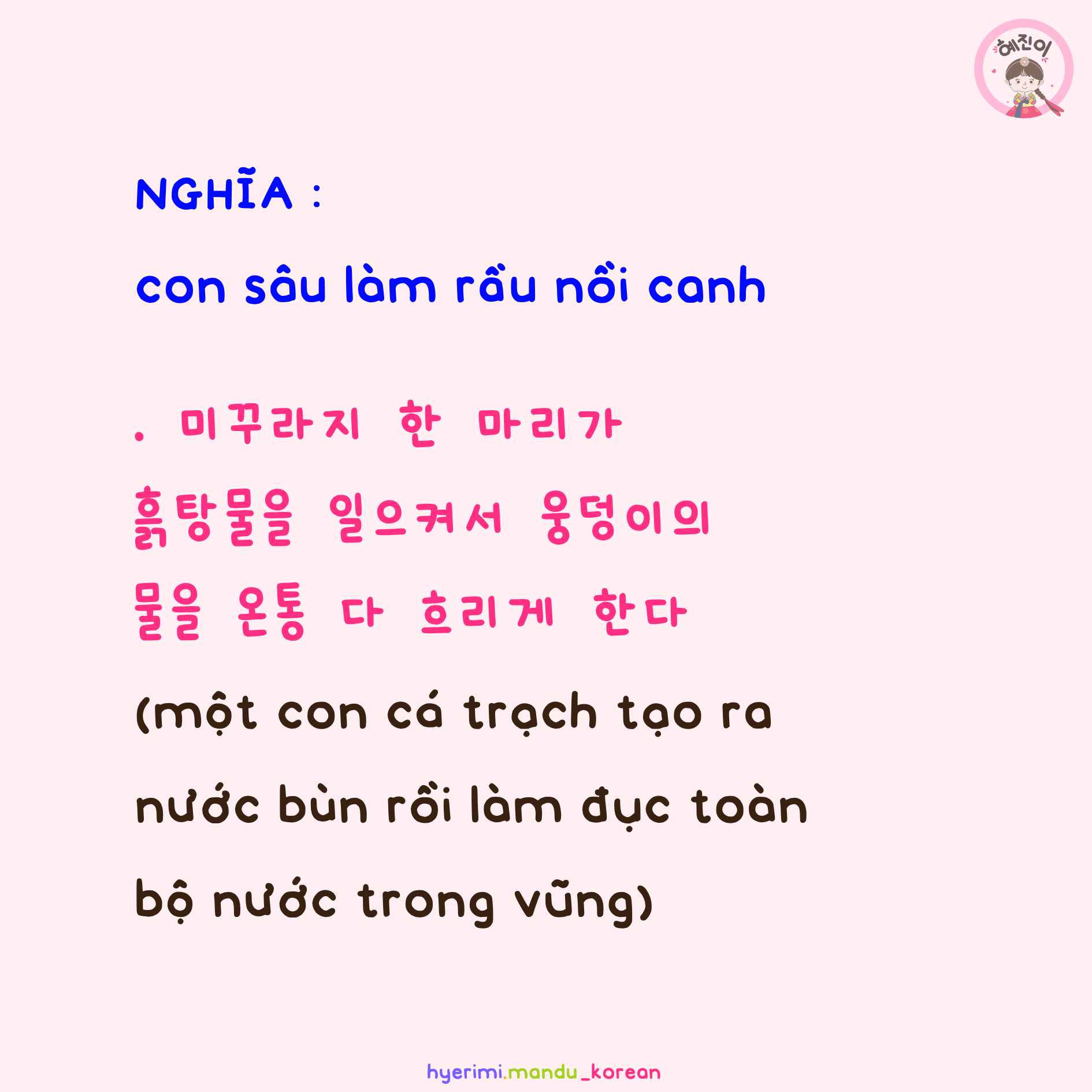 . 미꾸라지 : cá trạch . 한 (하나) : một . 마리 : con (đơn vị đếm) . 흙탕물 : nước bùn . 일으키다 : tạo ra . 웅덩이(의) : (của) vũng nước . 물 : nước . 온통 : toàn bộ . 다 : tất cả . 흐리다 : vẩn đục, lờ mờ