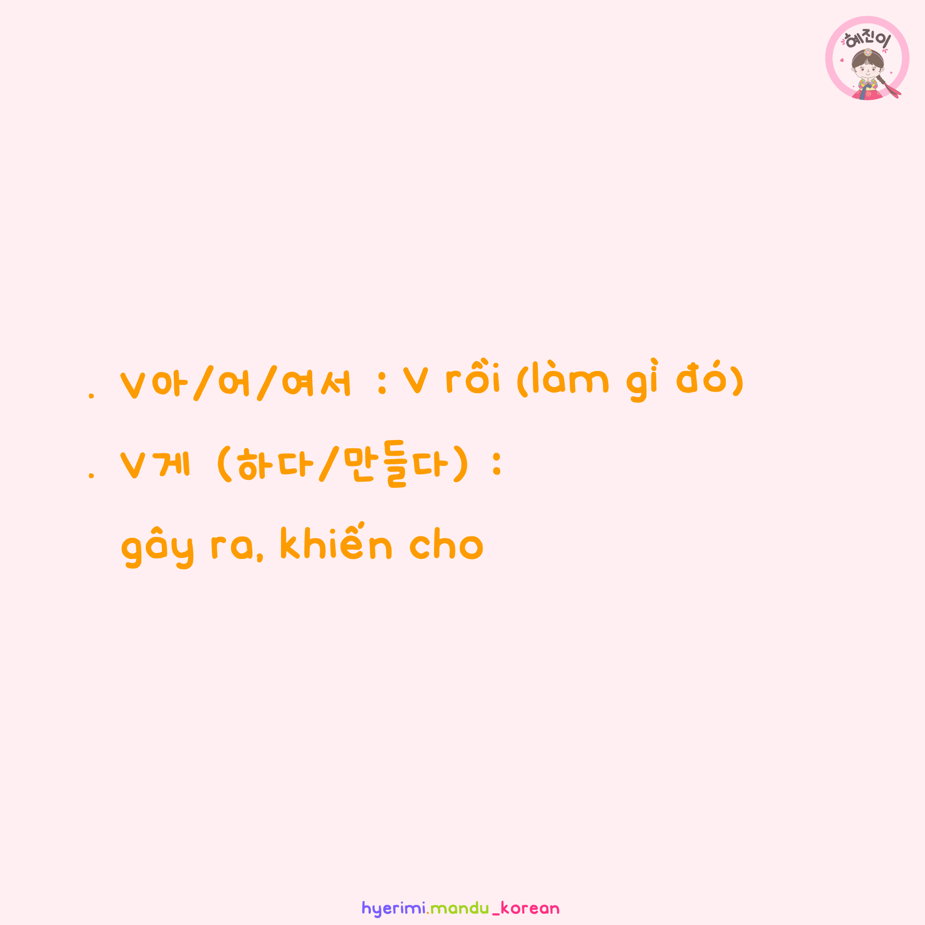 . V아/어/여서 : V rồi (làm gì đó) . V게 (하다/만들다) : gây ra, khiến cho