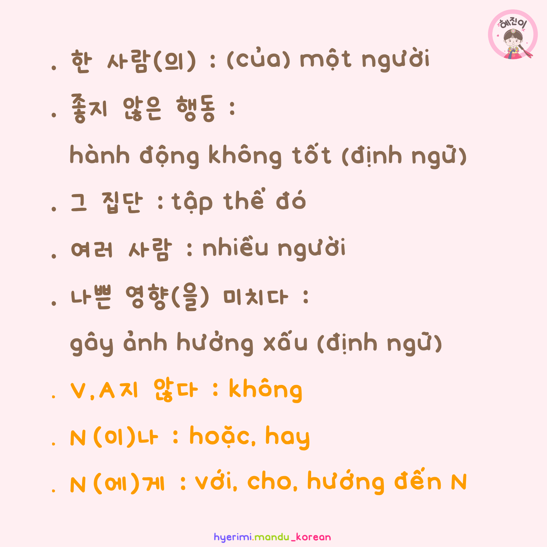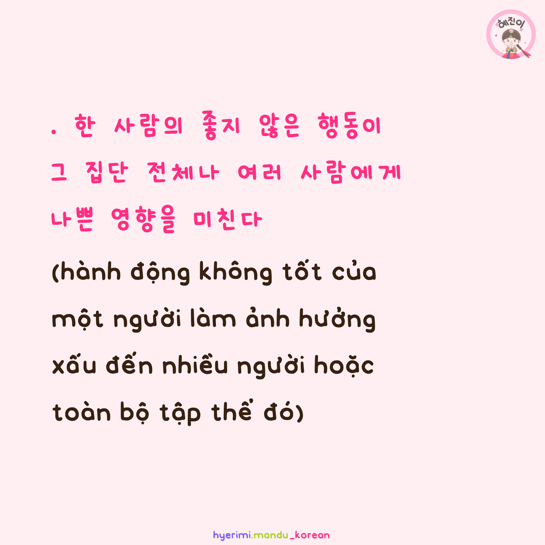 . 한 사람(의) : (của) một người . 좋지 않은 행동 : hành động không tốt (định ngữ) . 그 집단 : tập thể đó . 전체 : toàn bộ . 여러 사람 : nhiều người . 나쁜 영향(을) 미치다 : gây ảnh hưởng xấu (định ngữ) . V,A지 않다 : không . N(이)나 : hoặc, hay . N(에)게 : với, cho, hướng đến N