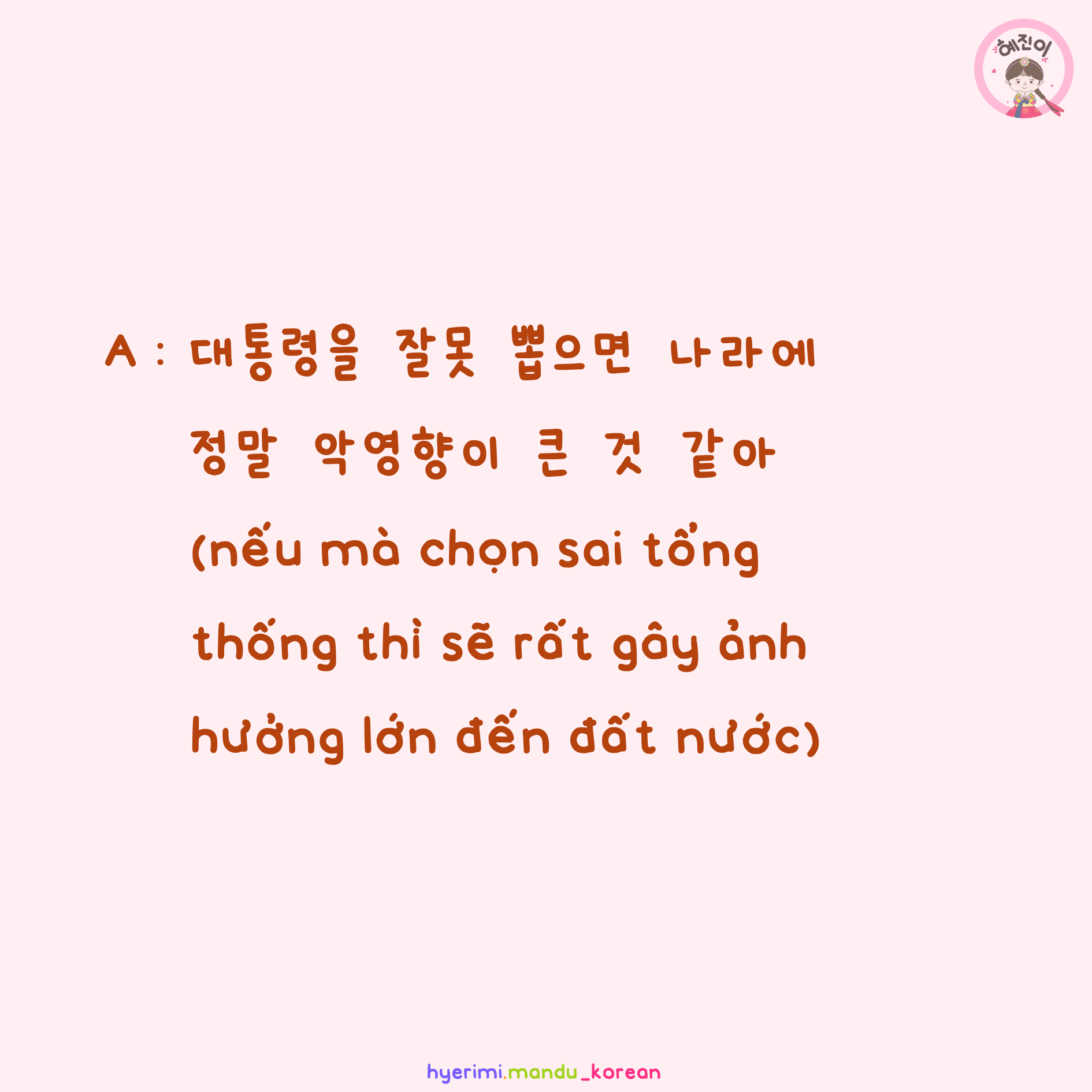 A : 대통령을 잘못 뽑으면 나라에 정말 악영향이 큰 것 같아 (nếu mà chọn sai tổng thống thì sẽ rất gây ảnh hưởng lớn đến đất nước)