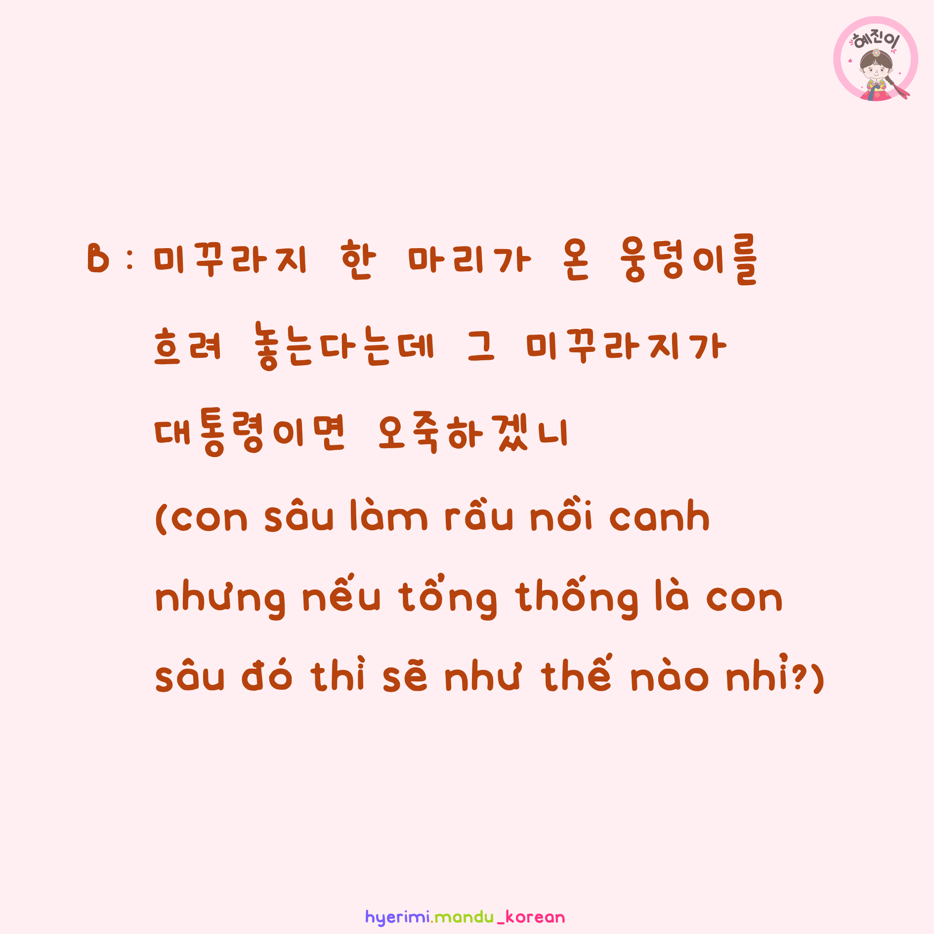 B : 미꾸라지 한 마리가 온 웅덩이를 흐려 놓는다는데 그 미꾸라지가 대통령이면 오죽하겠니 (con sâu làm rầu nồi canh nhưng nếu tổng thống là con sâu đó thì sẽ như thế nào nhỉ?)
