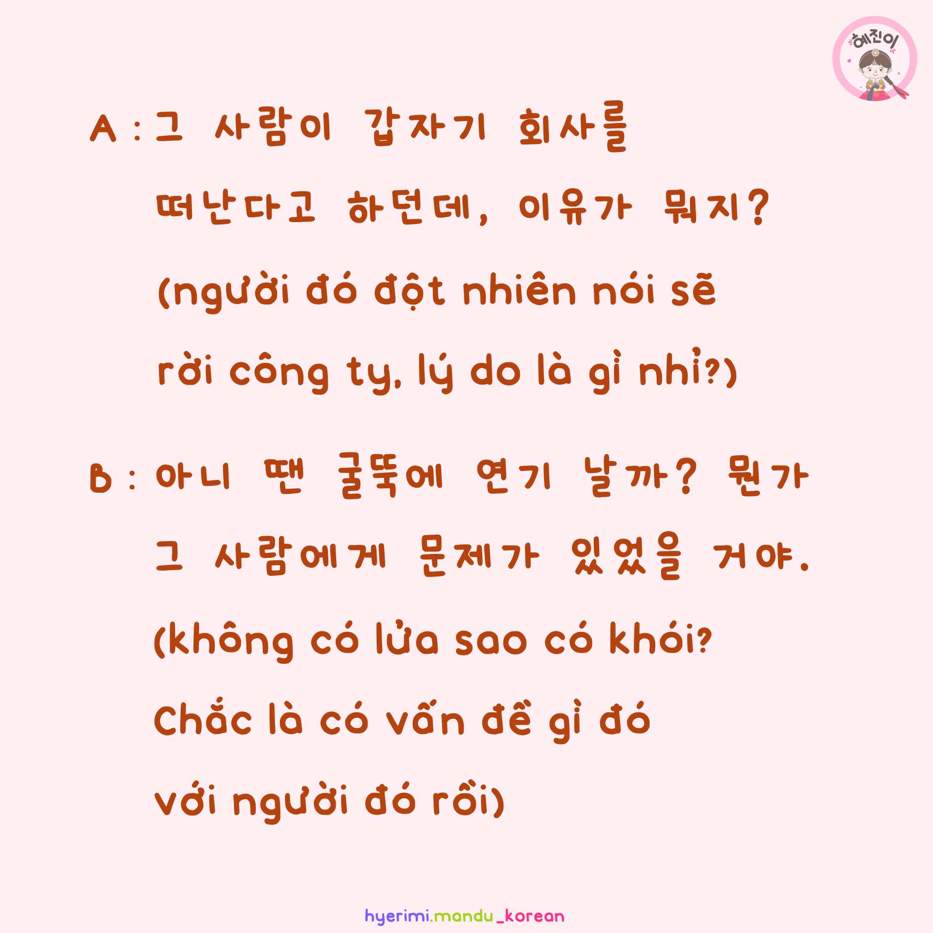 A : 그 사람이 갑자기 회사를 떠난다고 하던데, 이유가 뭐지?