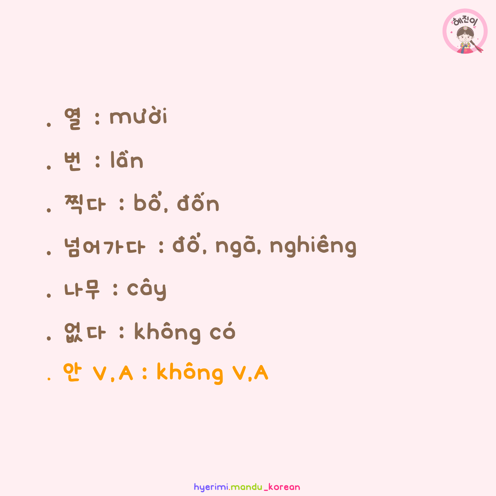 . 열 : mười . 번 : lần . 찍다 : bổ, đốn . 넘어가다 : đổ, ngã, nghiêng . 나무 : cây . 없다 : không có . 안 V,A : không V,A