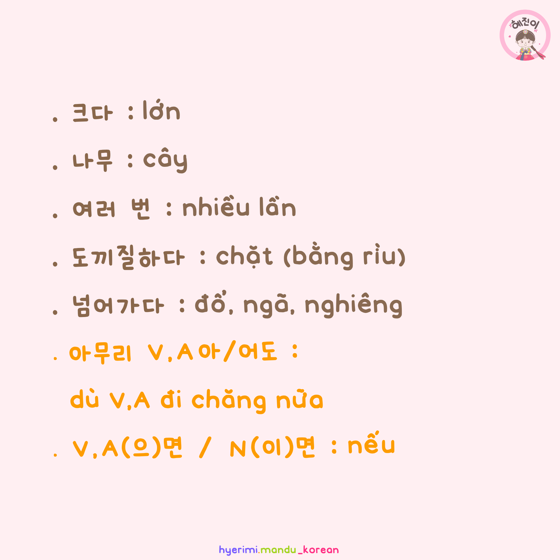 . 크다 : lớn . 나무 : cây . 여러 번 : nhiều lần . 도끼질하다 : chặt (bằng rìu) . 넘어가다 : đổ, ngã, nghiêng . 아무리 V,A아/어도 : dù V,A đi chăng nữa . V,A(으)면 / N(이)면 : nếu